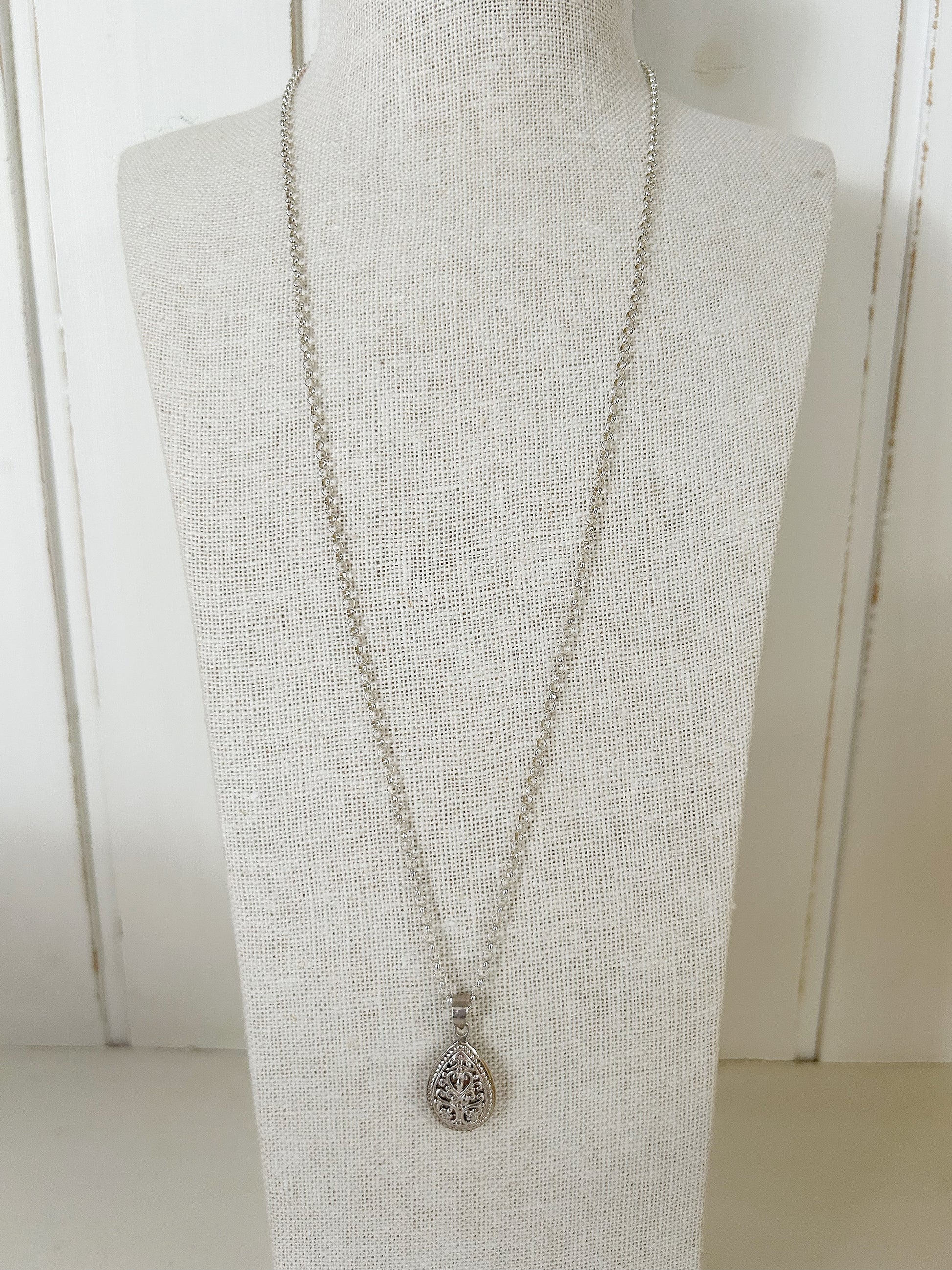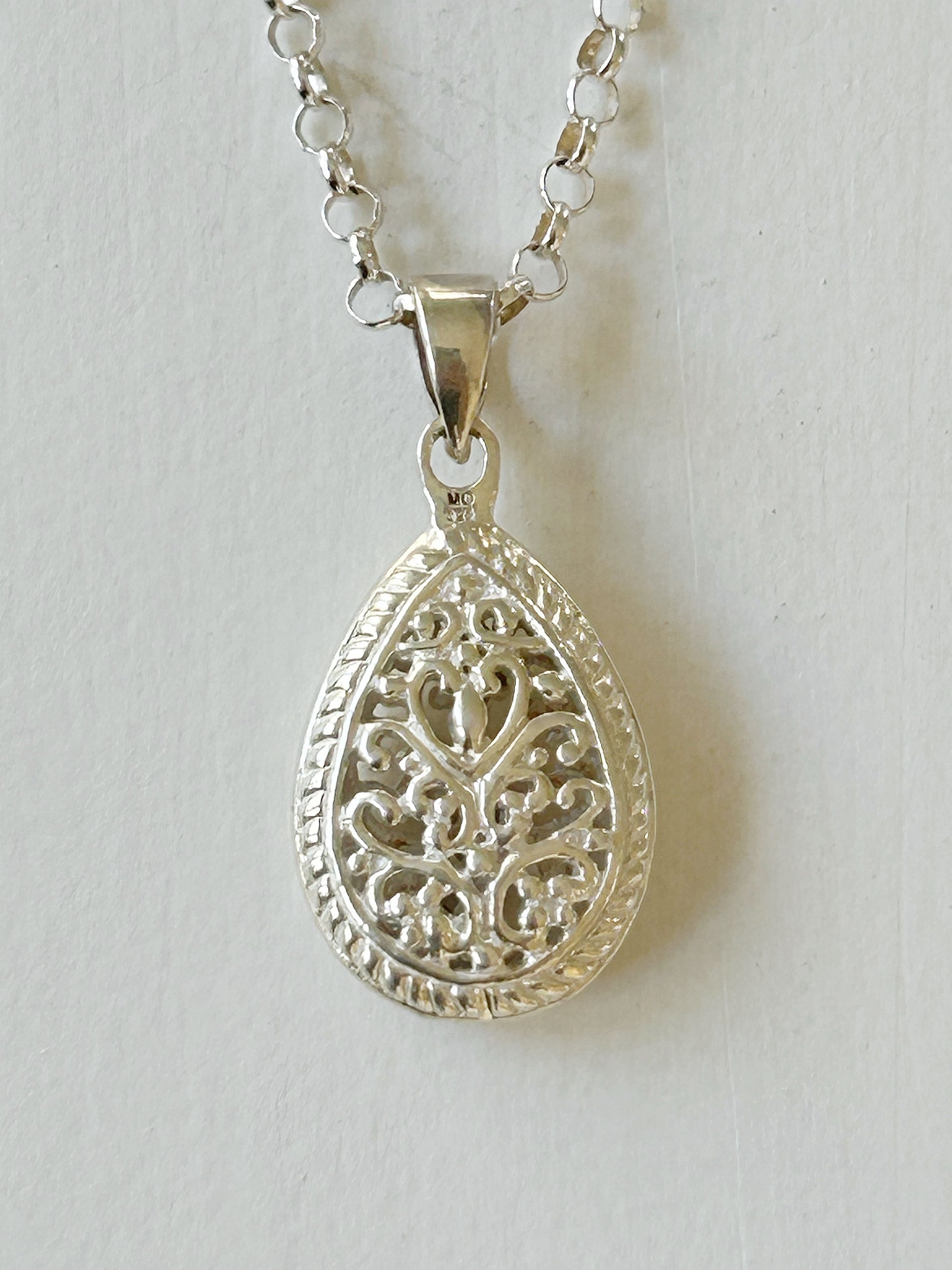 Dieser detailverliebte Anhänger aus 925er Silber verzaubert mit seiner filigranen Ornamentik in Tropfenform. Die geschwungenen Muster wirken feminin und klassisch zugleich – perfekt für jeden Tag oder als zartes Highlight zu besonderen Anlässen.
