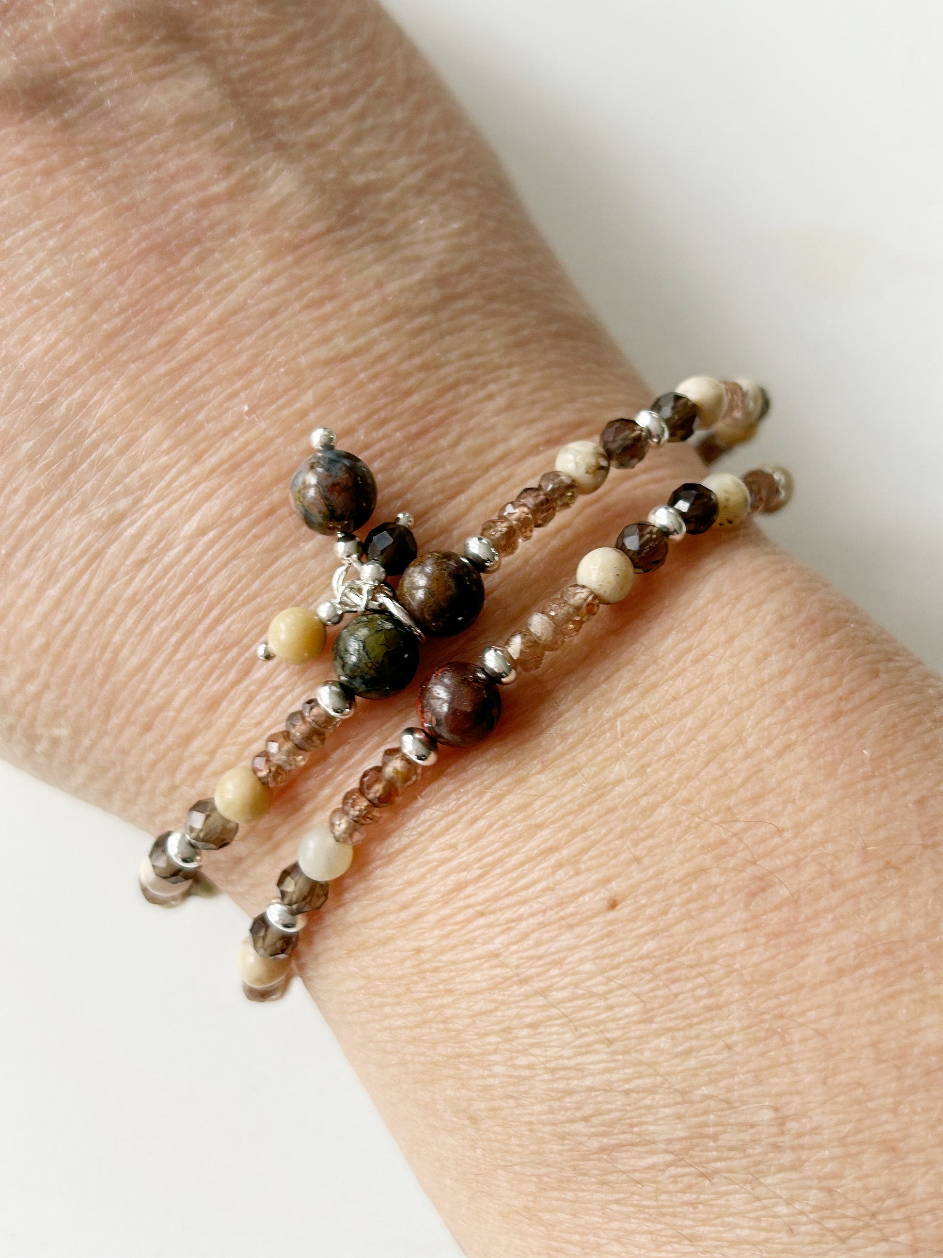 Dieses zweireihige Armband vereint verschiedene echte Edelsteine mit zarten Silberdetails – liebevoll von Hand gefertigt und voller Bedeutung. Die natürliche Farbpalette reicht von warmen Brauntönen bis zu sanften Cremefarben – jedes Stück ist ein Unikat.