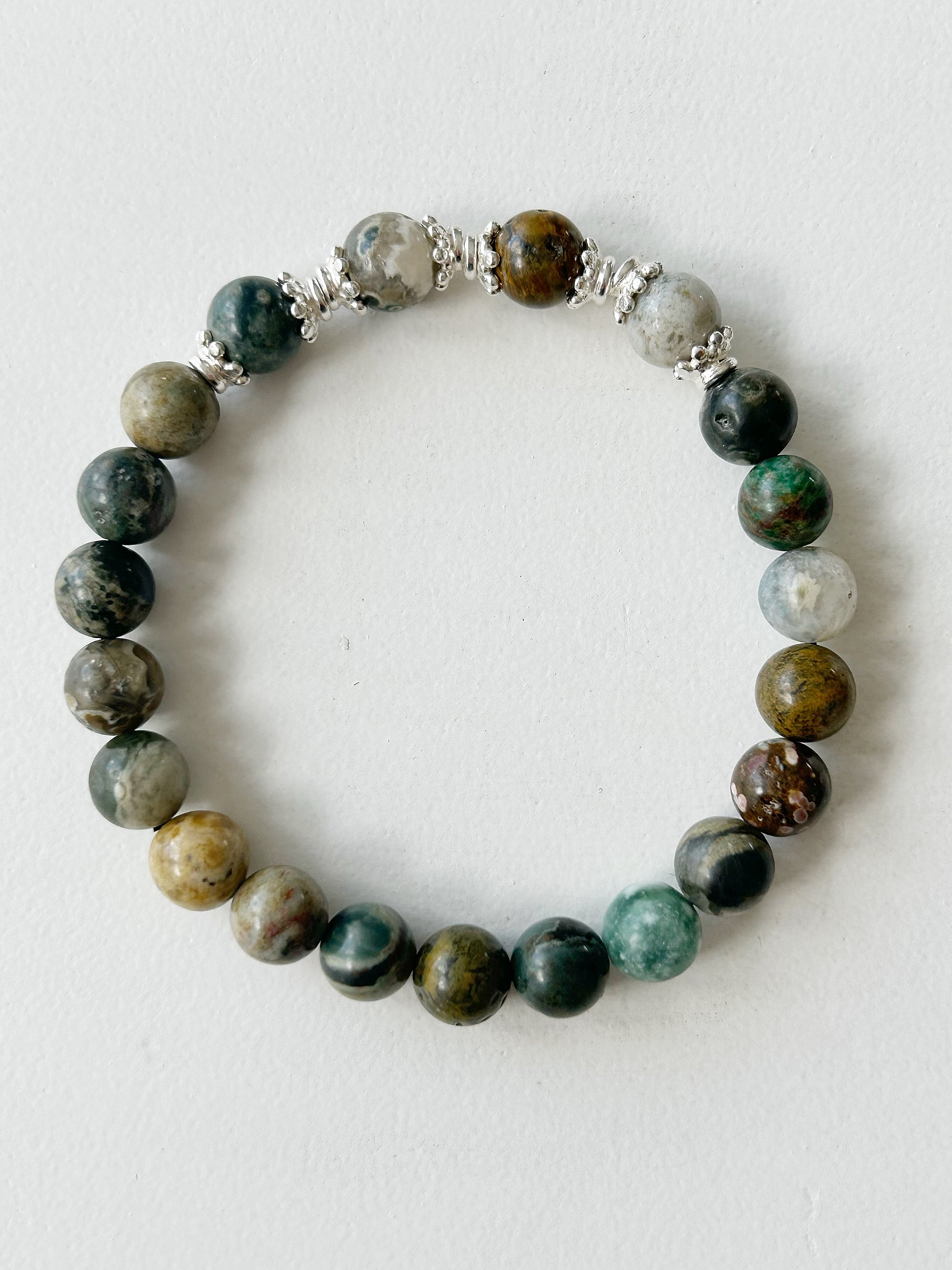 Dieses elastische Armband aus 8 mm Jaspis-Steinen zeigt sich in natürlichen Farbnuancen von Grün, Braun, Beige und Grau. Die harmonisch aufgereihten Steine verleihen dem Schmuckstück eine erdende Ausstrahlung – perfekt für jeden Tag und jedes Outfit.