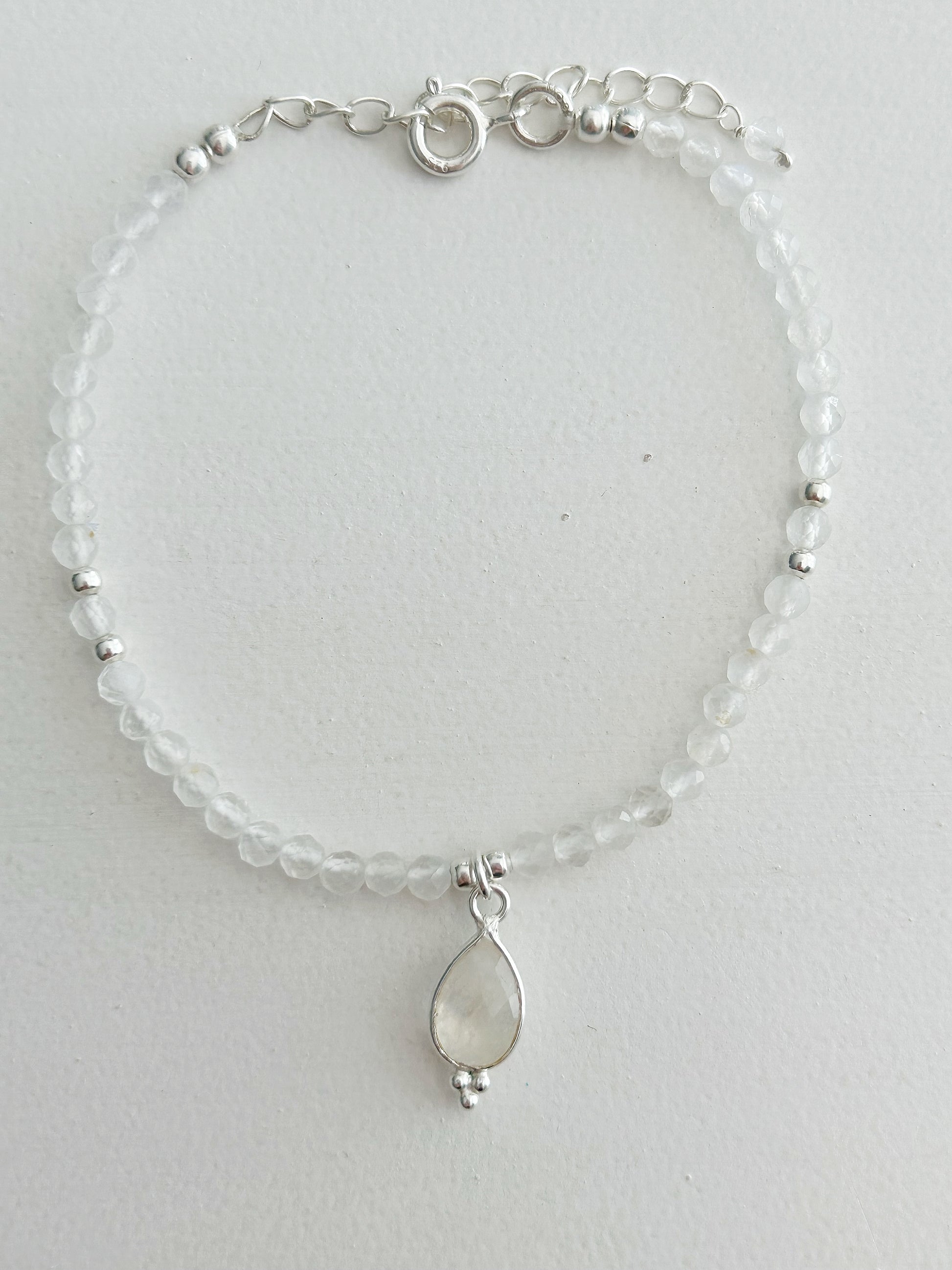 Dieses filigrane Armband mit facettierten Regenbogenmondstein-Perlen schimmert je nach Lichteinfall in sanften Regenbogenfarben – ein faszinierendes Spiel aus Licht und Transparenz, das die Sinne verzaubert. Der tropfenförmige Anhänger in 925er Silber unterstreicht die feine Ausstrahlung und macht das Schmuckstück zu einem besonderen Begleiter – feminin, edel und voller Ausstrahlung.