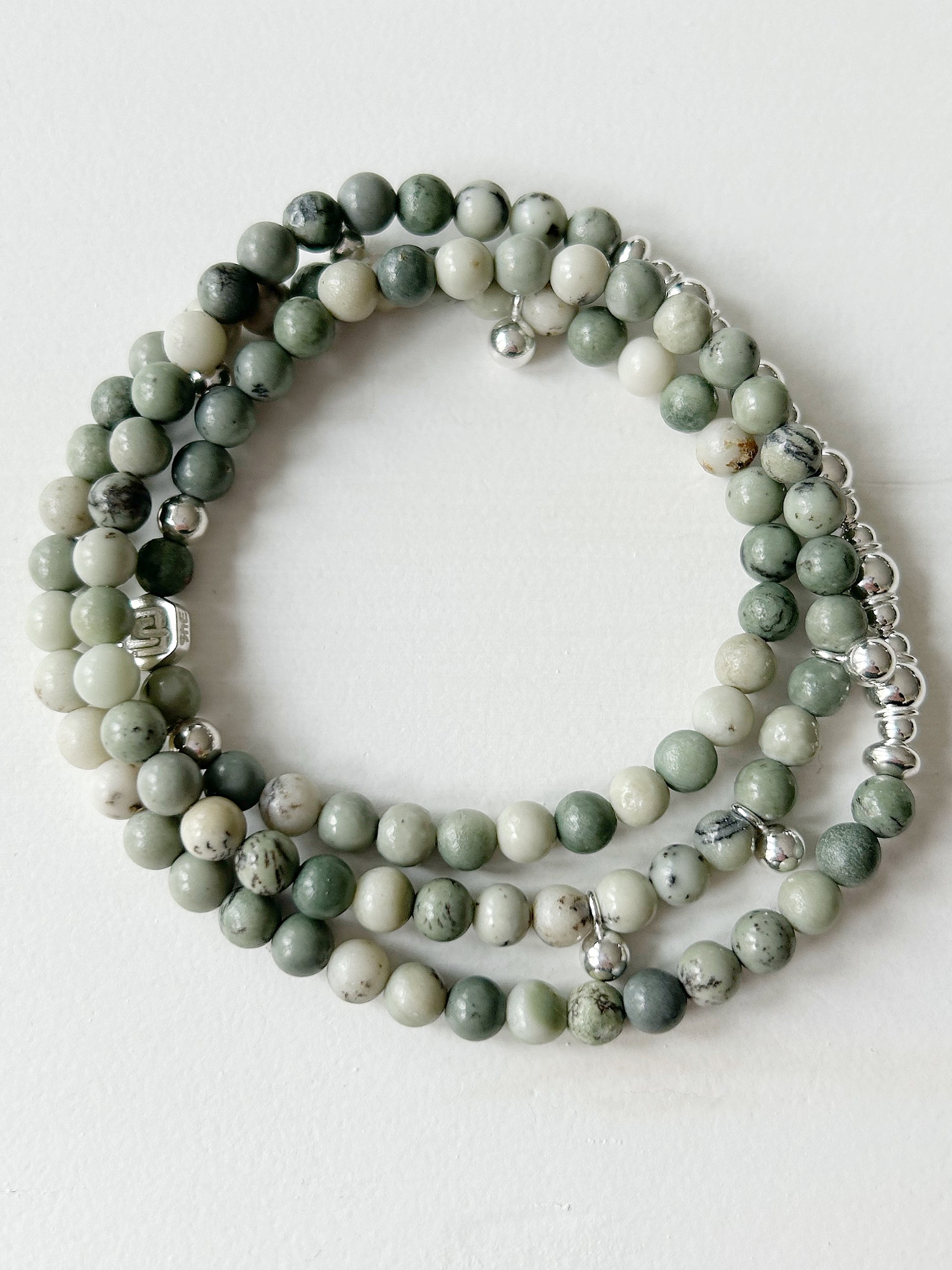 Dieses dreireihige Armband aus echtem Jaspis vereint harmonische Erdtöne mit sanftem Glanz. Die Kombination aus cremefarbenen, grünen und gemusterten Steinen wird durch feine Silberelemente ergänzt – ideal für alle, die Natürlichkeit und Eleganz verbinden möchten.