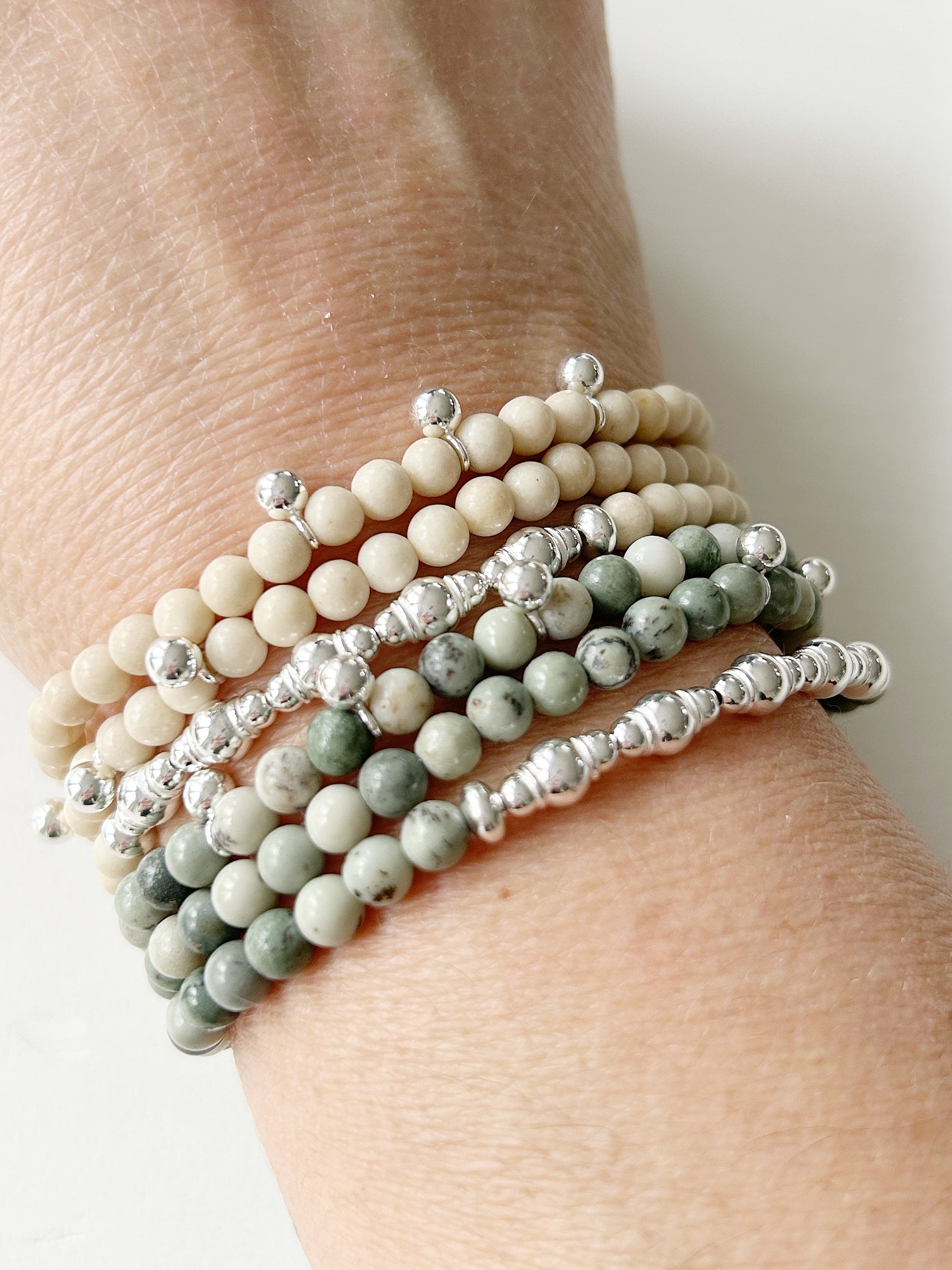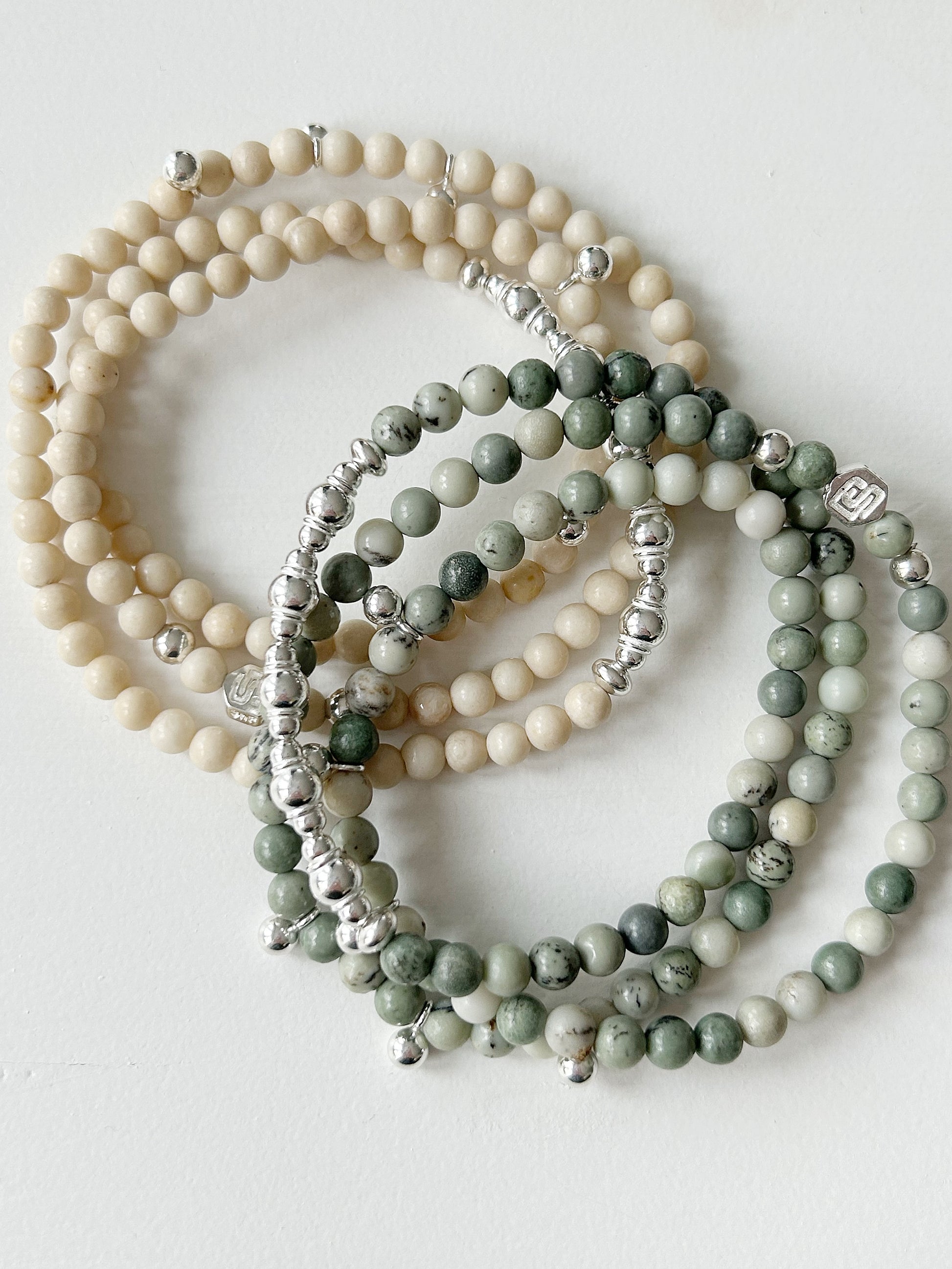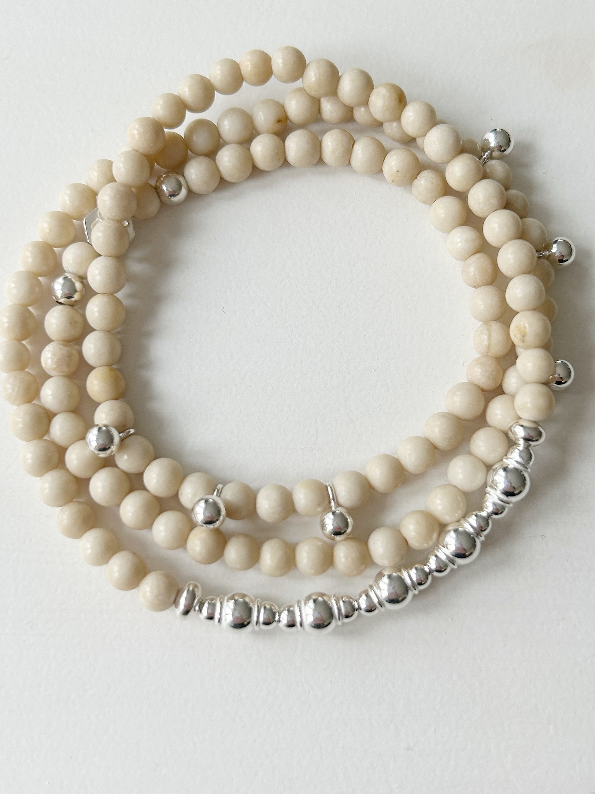 Dieses elegante dreireihige Armband aus echtem Riverstone beeindruckt mit seinen sanften Naturtönen und dezenten Silberelementen. Die helle Farbgebung passt zu jedem Outfit und verleiht einen frischen, harmonischen Look.