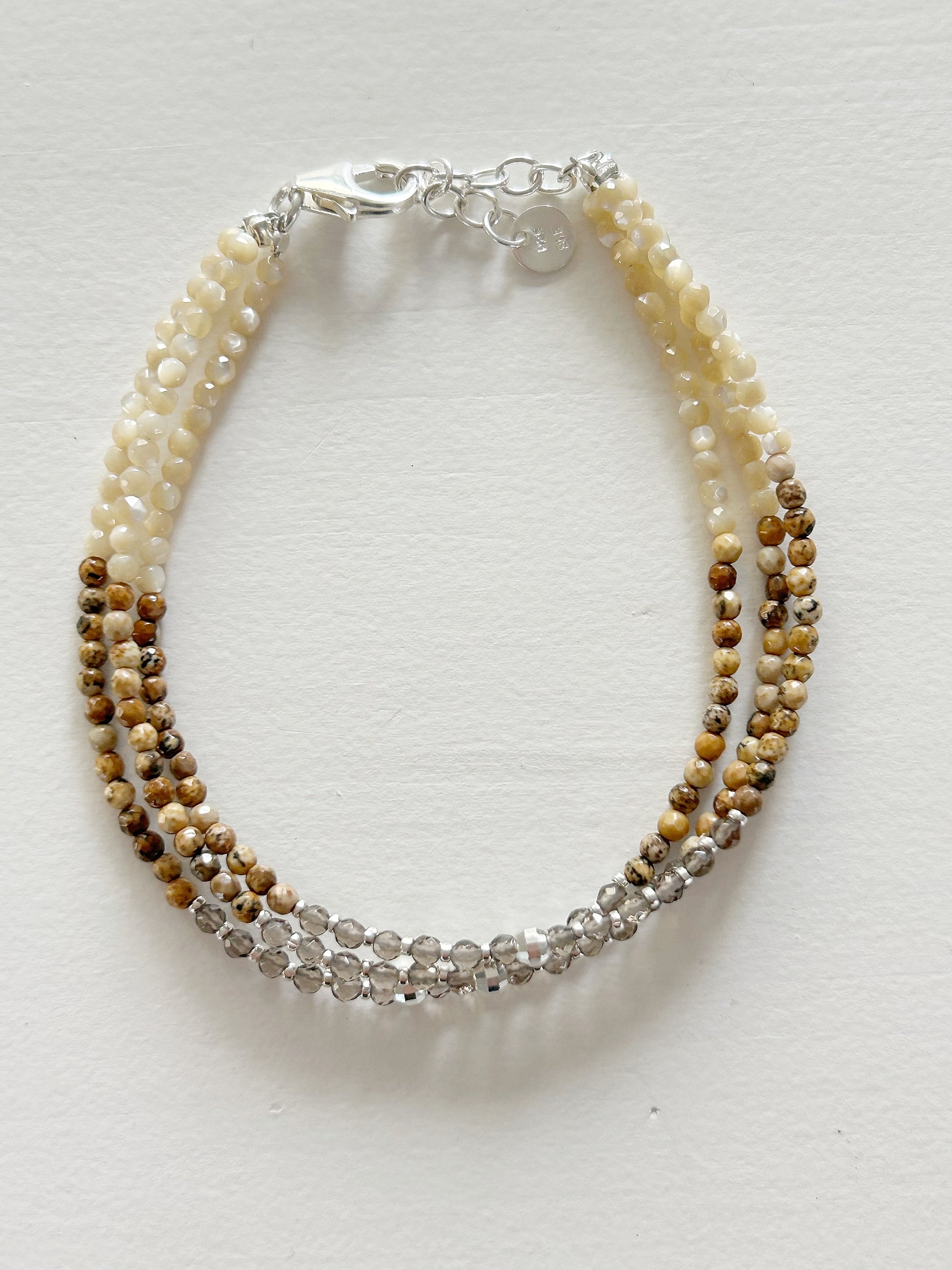 Drei filigrane Reihen in zarten Brauntönen vereinen sich zu einem eleganten Armband mit feinen, facettierten Edelsteinen. Die Kombination aus schimmerndem Perlmutt, kräftigem Landschaftsjaspis und sanftem Rauchquarz bringt Harmonie und Tiefe – ein Schmuckstück, das sowohl optisch als auch symbolisch berührt. Jeder Stein trägt seine eigene Geschichte, gemeinsam ergeben sie ein stimmiges Ganzes für dein Handgelenk.