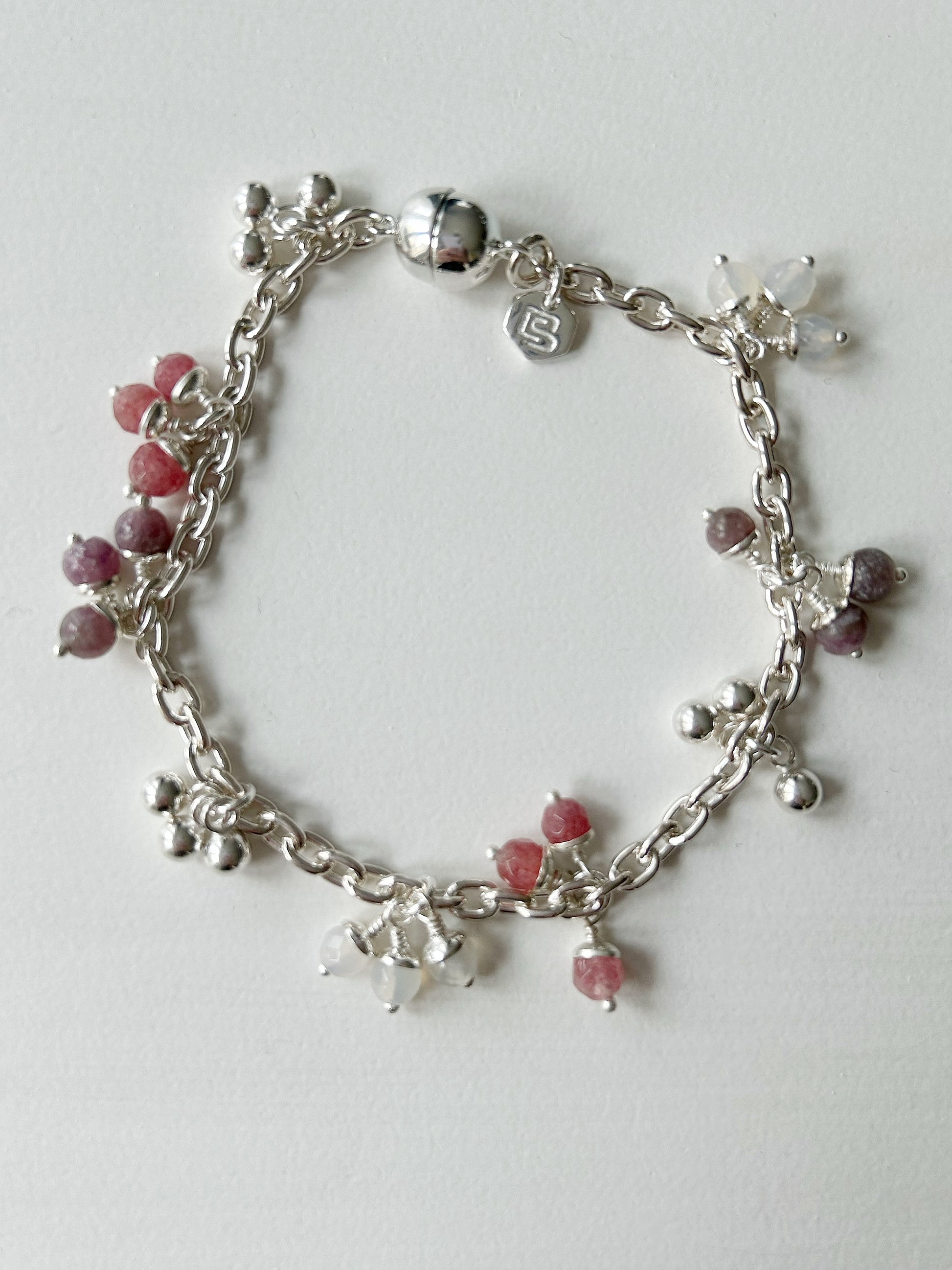 Diese zarte Silberarmkette vereint feine Edelsteine in zarten Rosa-, Weiß- und Grautönen – ein femininer Begleiter mit liebevollen Details. Dank Magnetverschluss ist sie besonders einfach anzulegen.