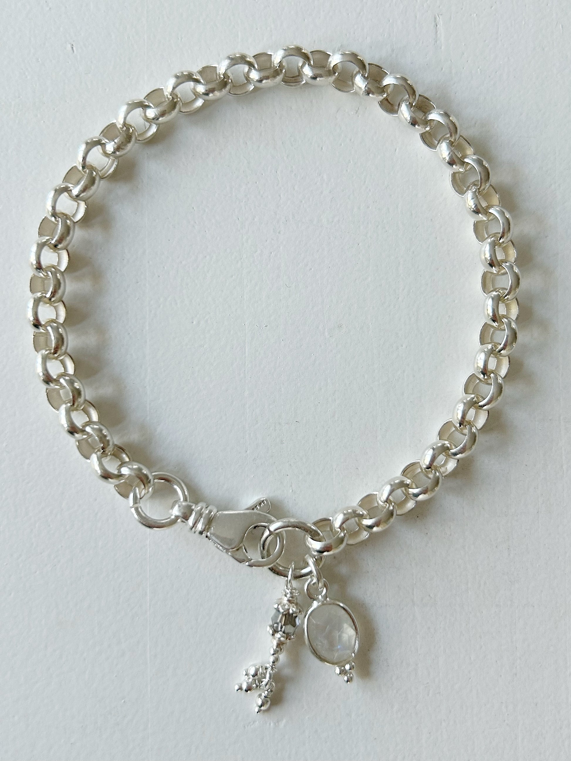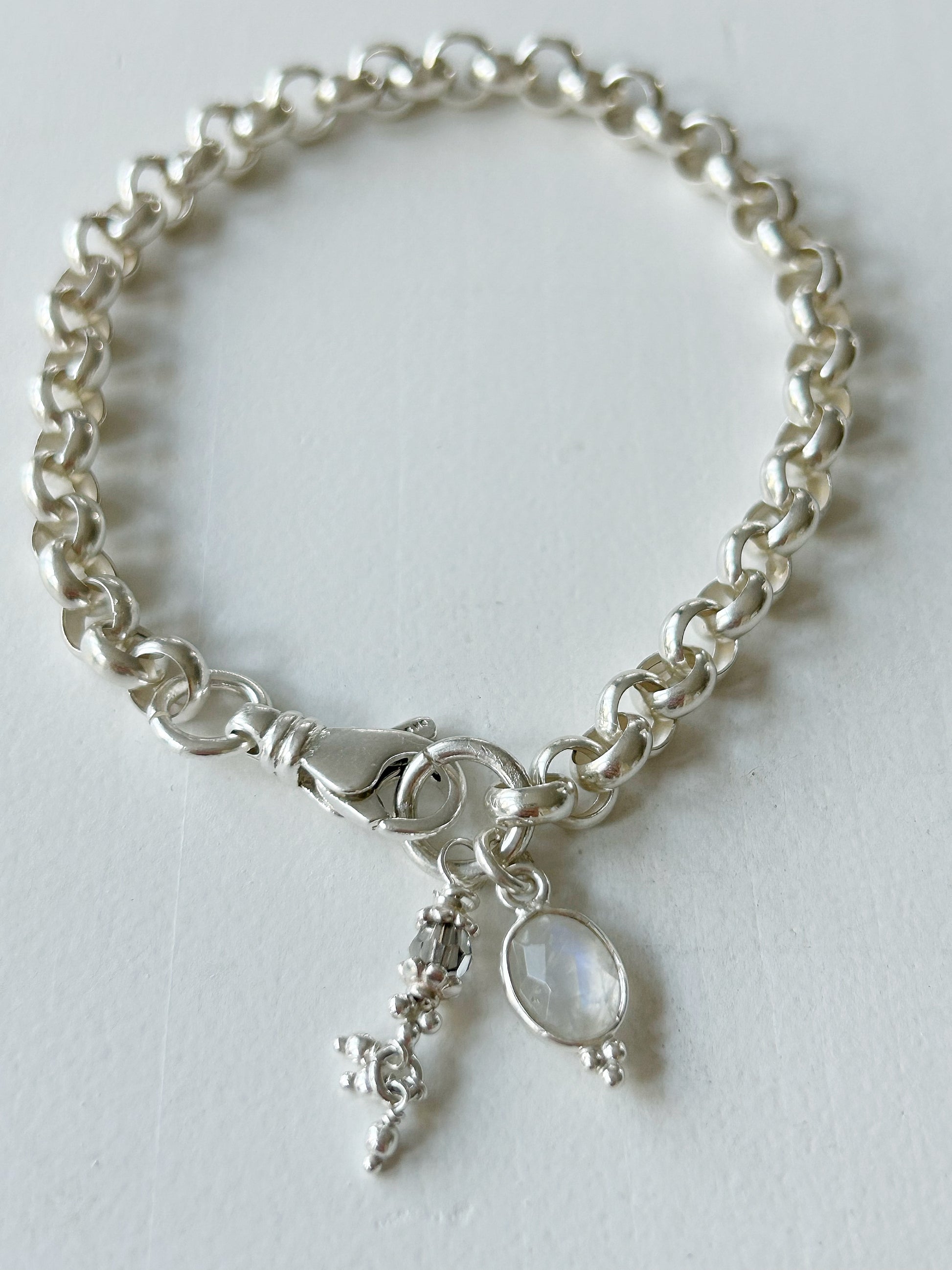 Diese hochwertige Armkette aus 925er Silber kombiniert starke Glieder mit feinen Details: Ein schimmernder Bergkristall-Anhänger und filigrane Silberkügelchen verleihen dem Schmuckstück eine elegante und gleichzeitig verspielte Note.