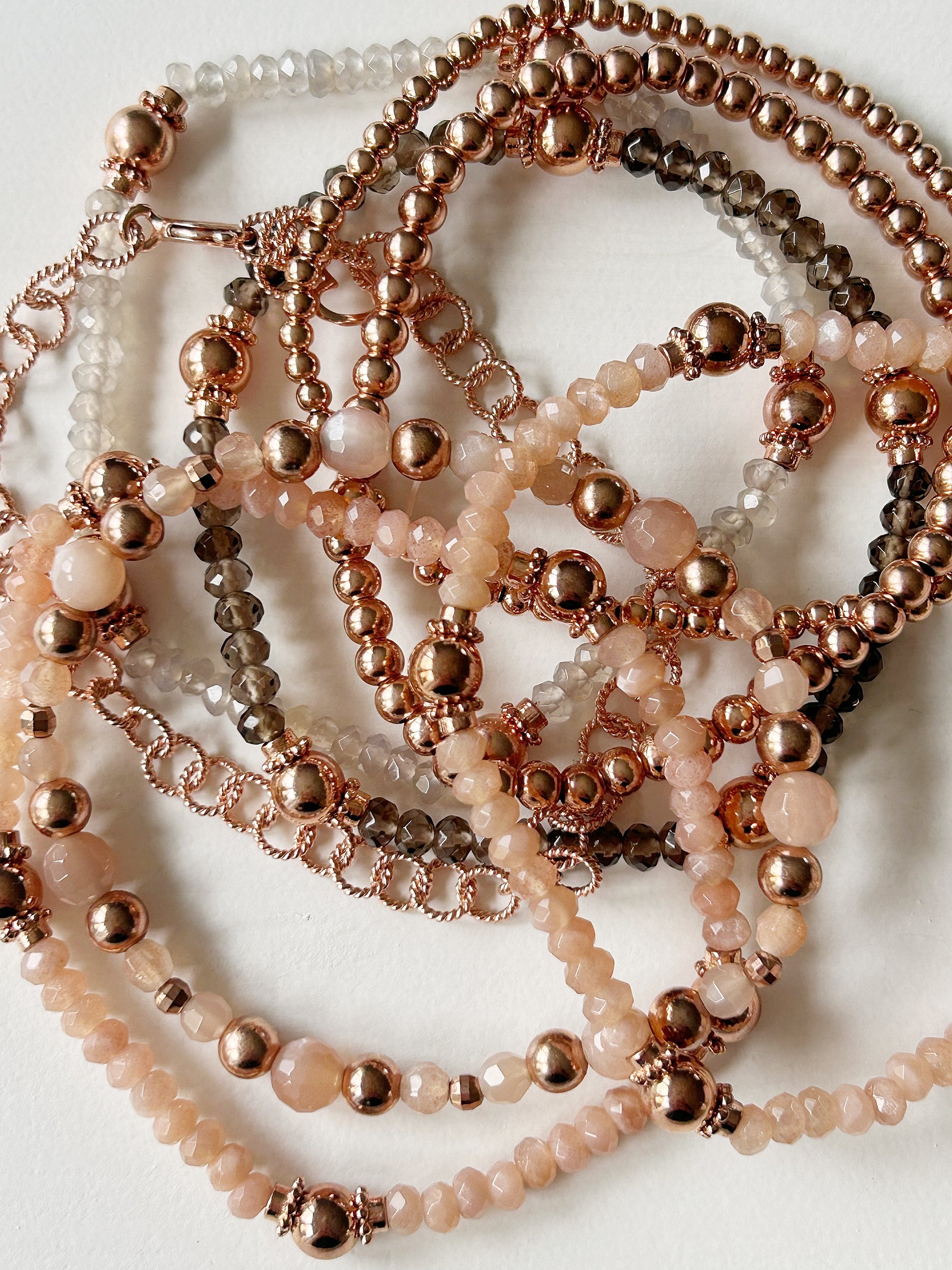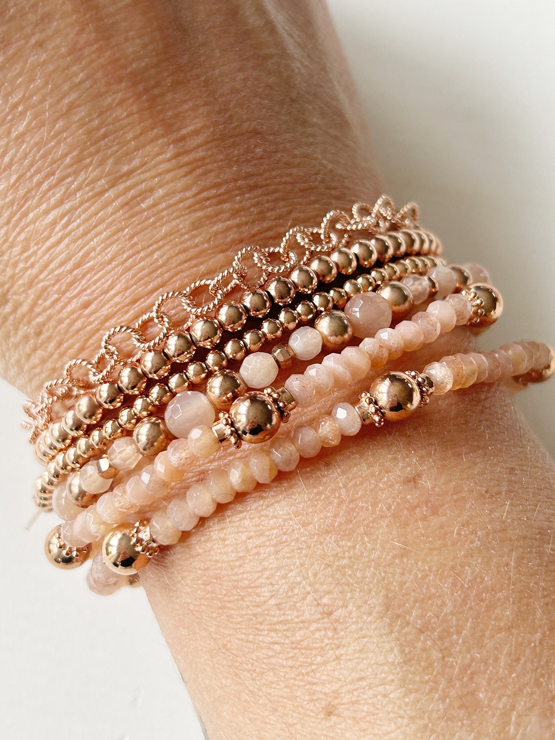 Dieses Armband bezaubert mit seinem warmen Schimmer und den zarten Rosétönen des Orangen Mondsteins. Die Kombination mit rosévergoldeten Elementen verleiht dem Schmuckstück eine elegante Leichtigkeit – wie ein Hauch von Sonnenaufgang am Handgelenk.