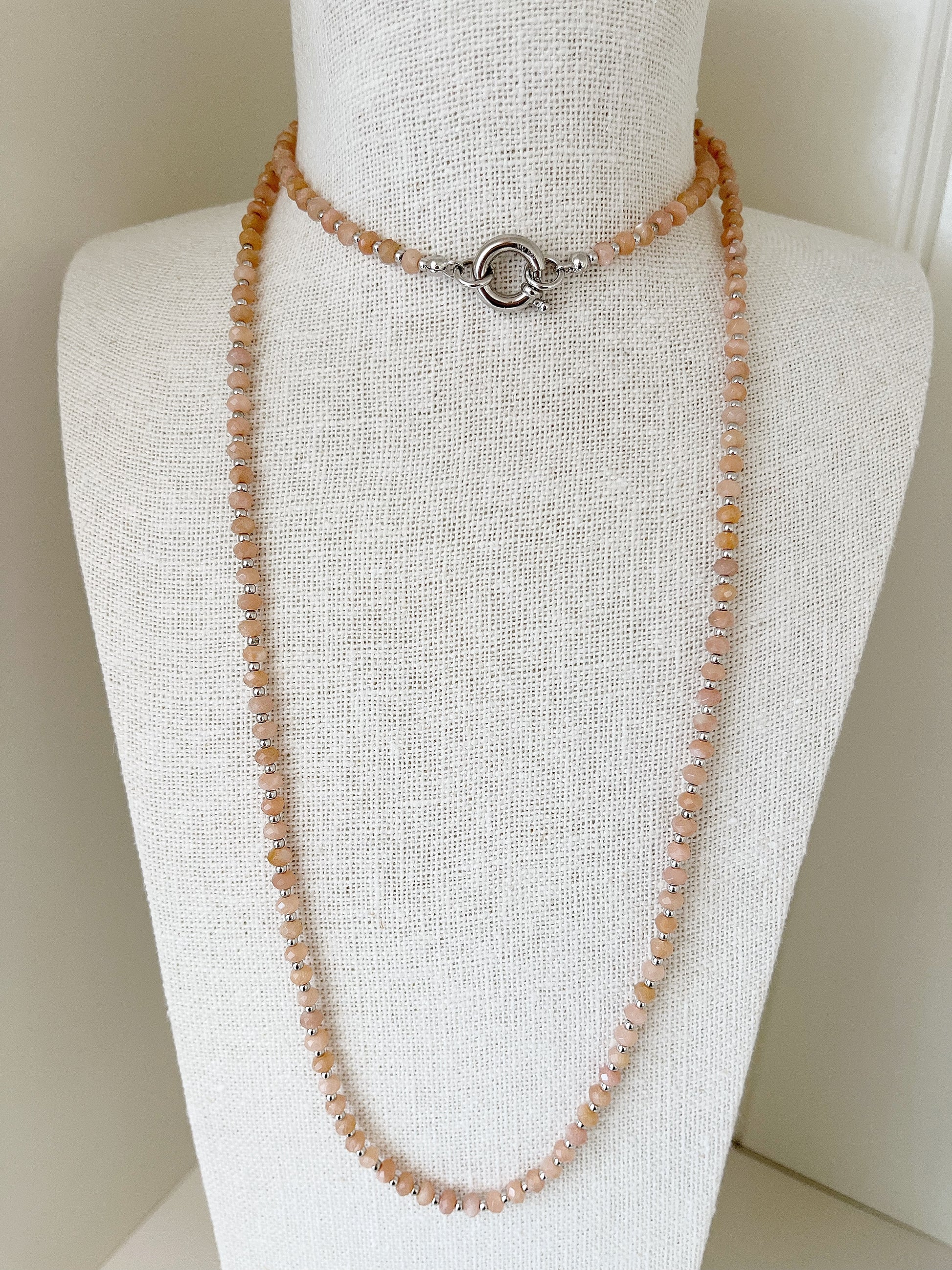 Diese edle Halskette aus orangem Mondstein und feinen Silberelementen verbindet sanften Glanz mit einer femininen Ausstrahlung. Die zart schimmernden Steine verleihen ihr eine warme Eleganz – ideal für besondere Momente oder als ausdrucksstarkes Alltagsstück.