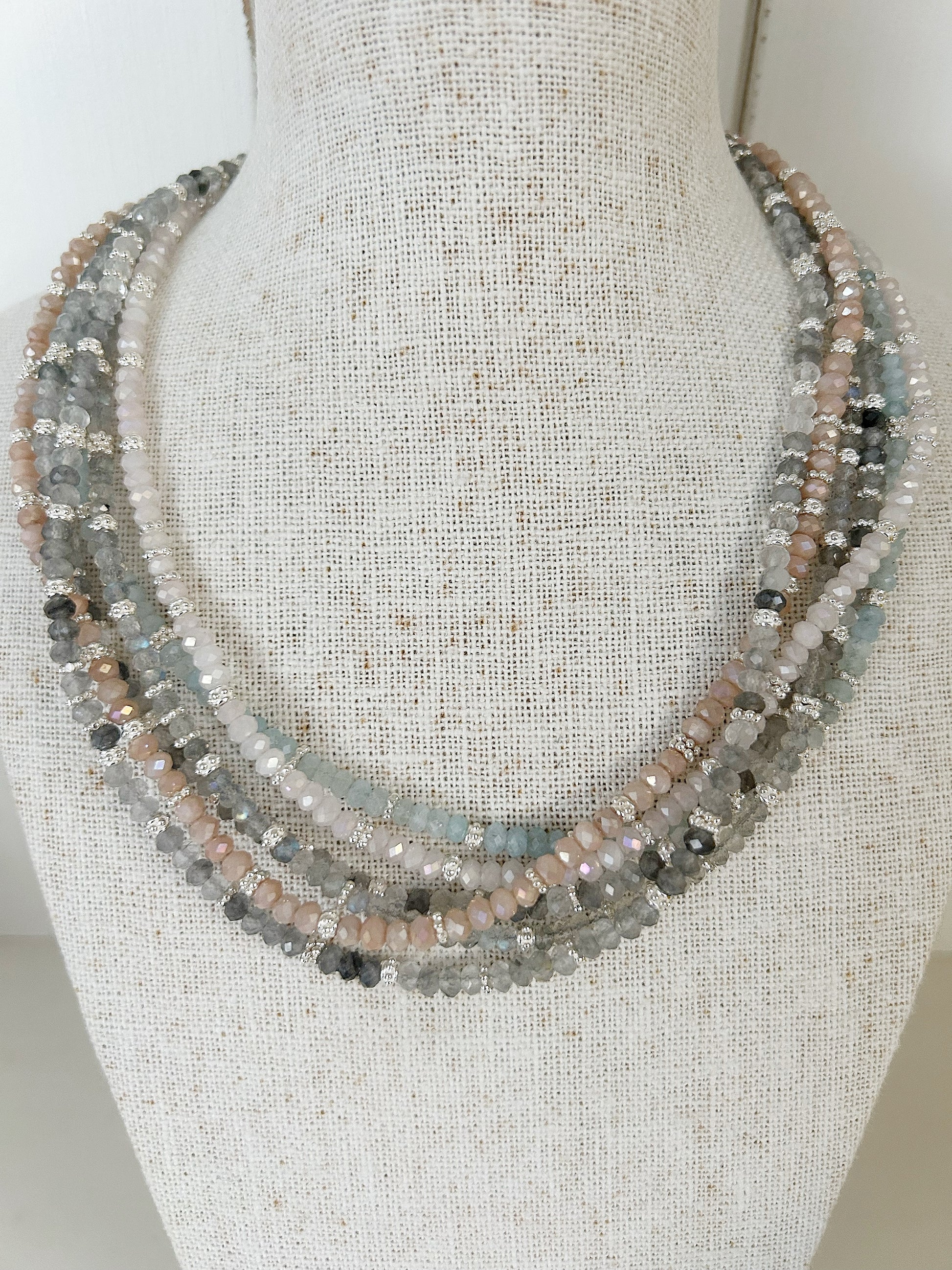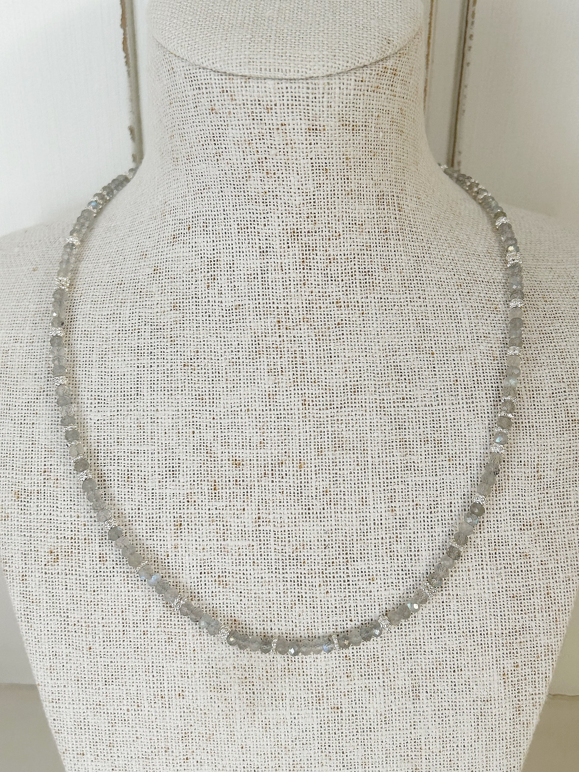 Diese stilvolle Halskette kombiniert facettierten Labradorit in sanften Grau- und Taupetönen mit feinen Silberelementen. Die edle Farbkomposition verleiht jedem Outfit eine geheimnisvolle Note – elegant, ausdrucksstark und doch dezent.