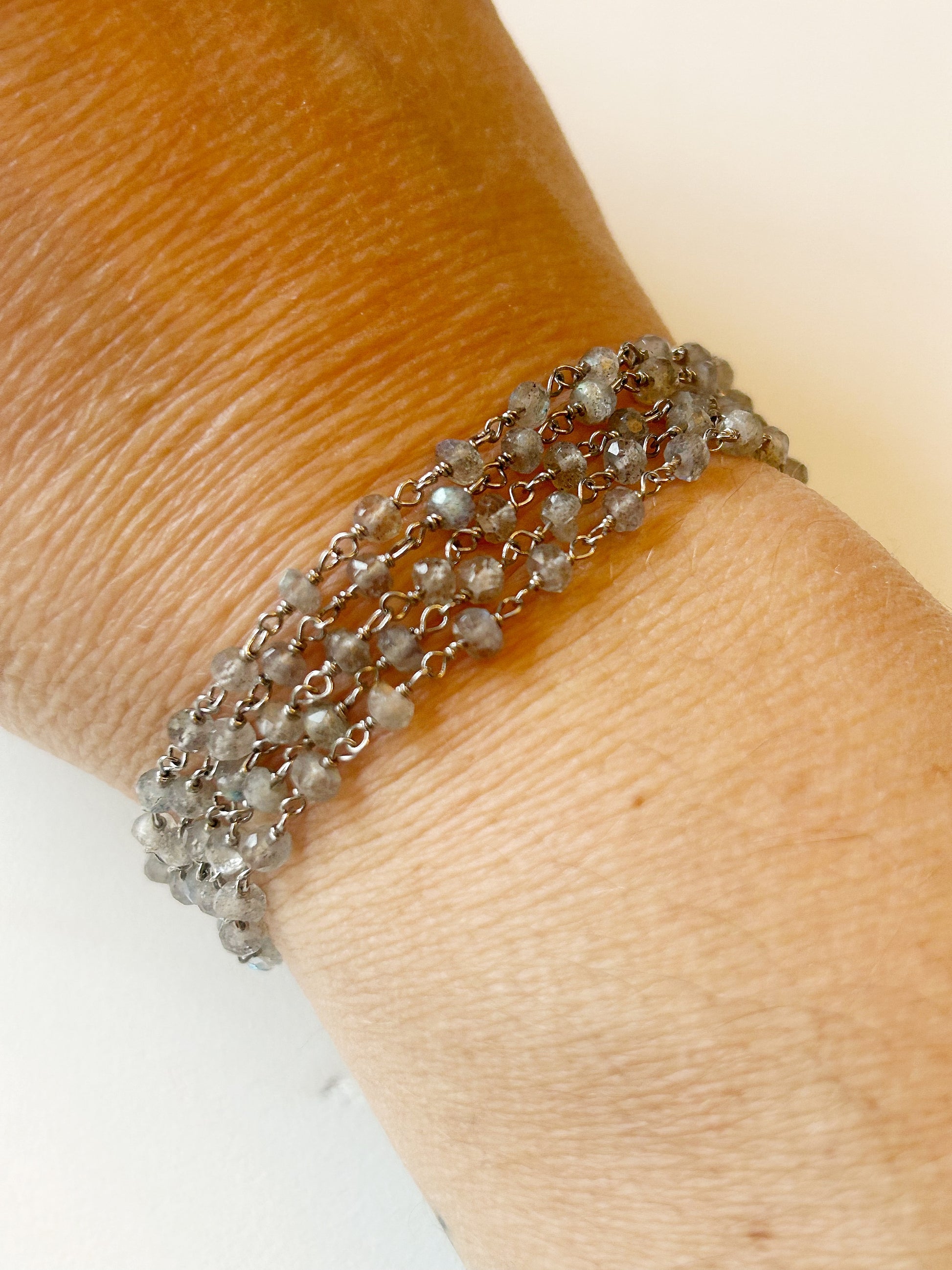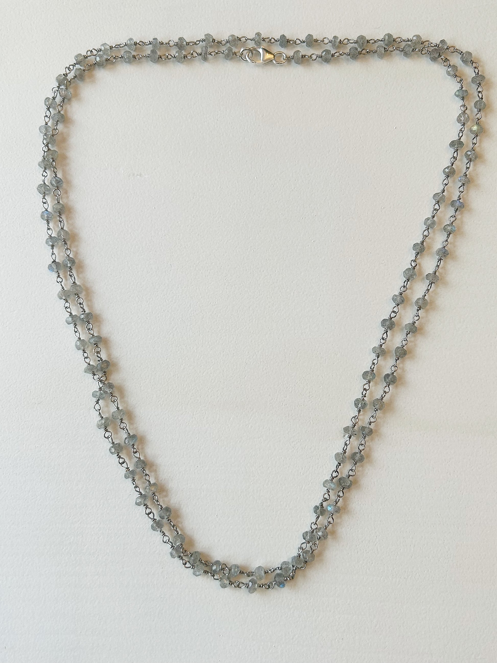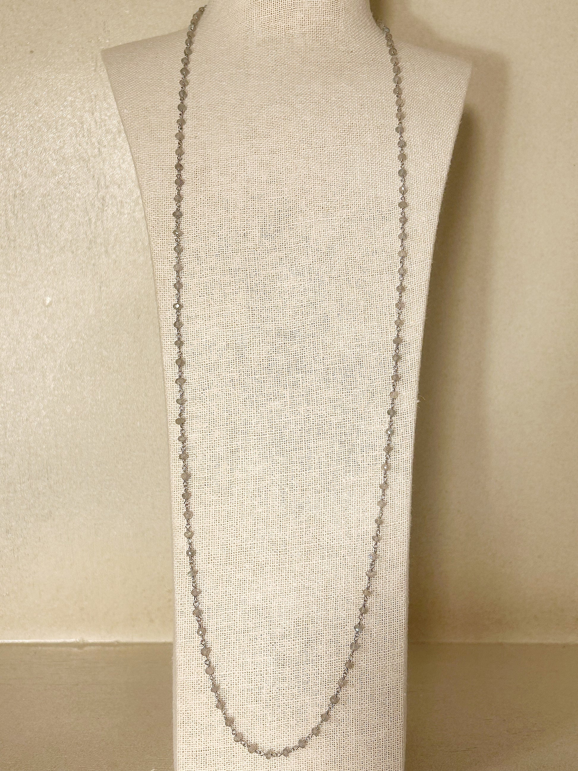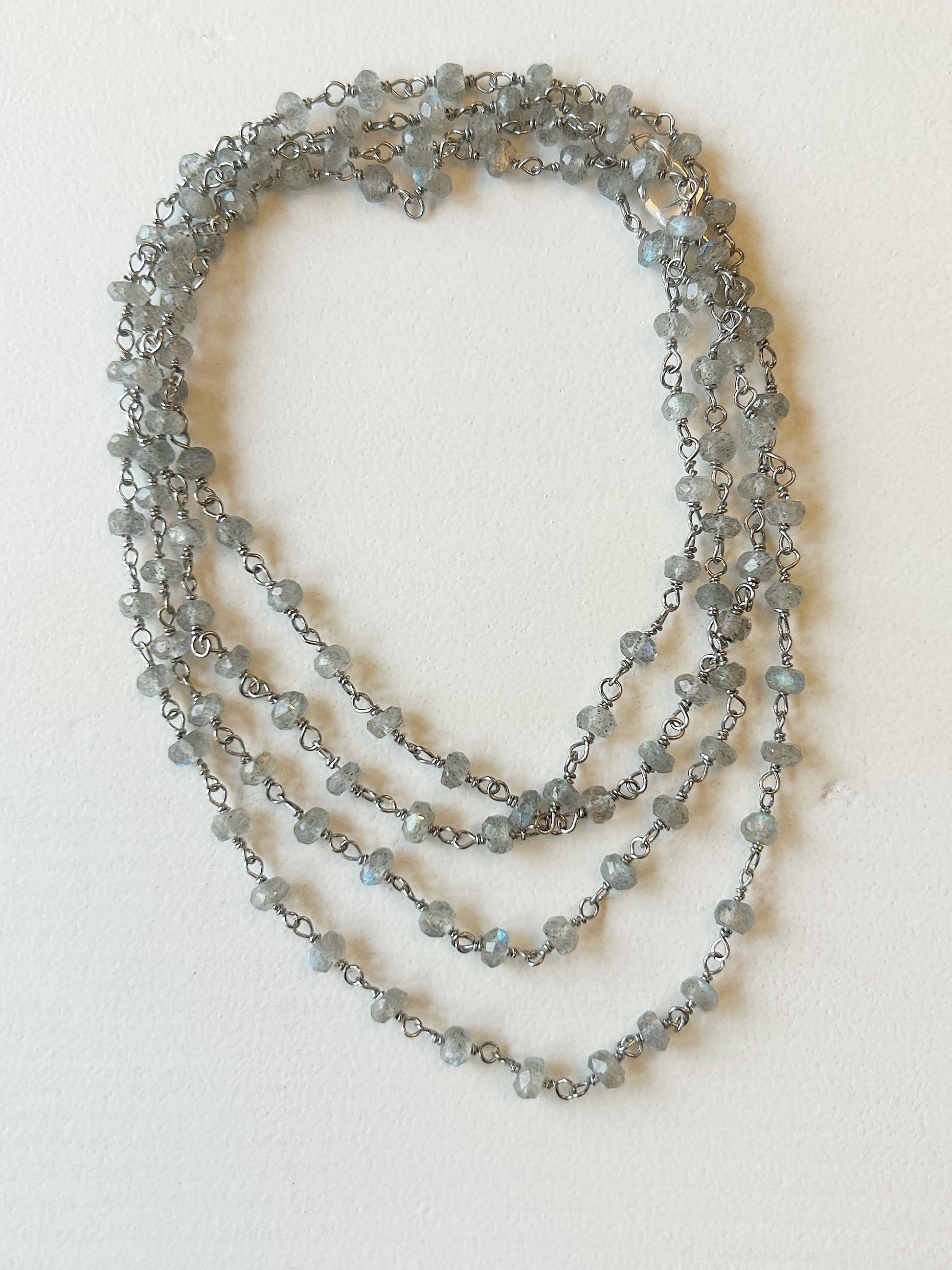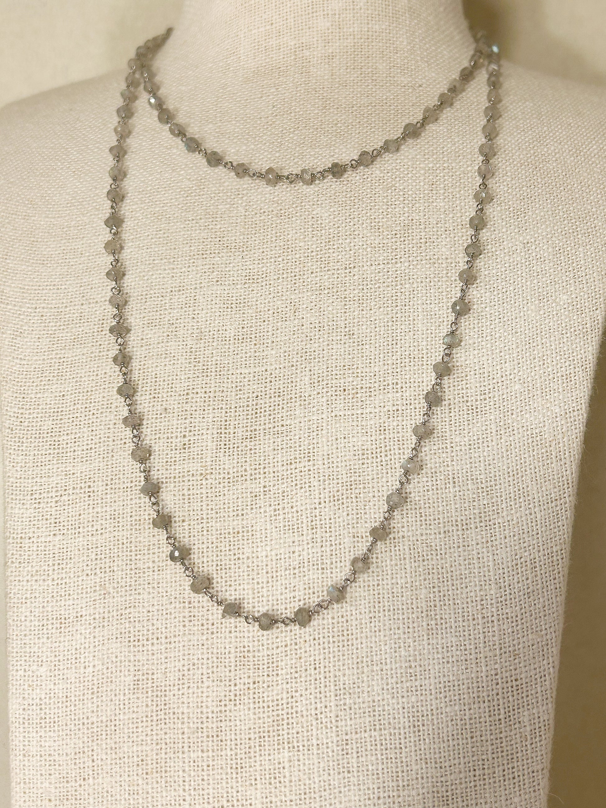 Diese edle Halskette aus Labradorit-Steinen begeistert mit ihrem geheimnisvollen Schimmer und ihrer zeitlosen Eleganz. Die sanften grauen Töne mit schillerndem Lichtspiel verleihen jedem Look eine besondere Note – ob einzeln getragen oder im Layering-Stil. Dank ihrer Länge lässt sie sich auch stilvoll als Armband wickeln.
