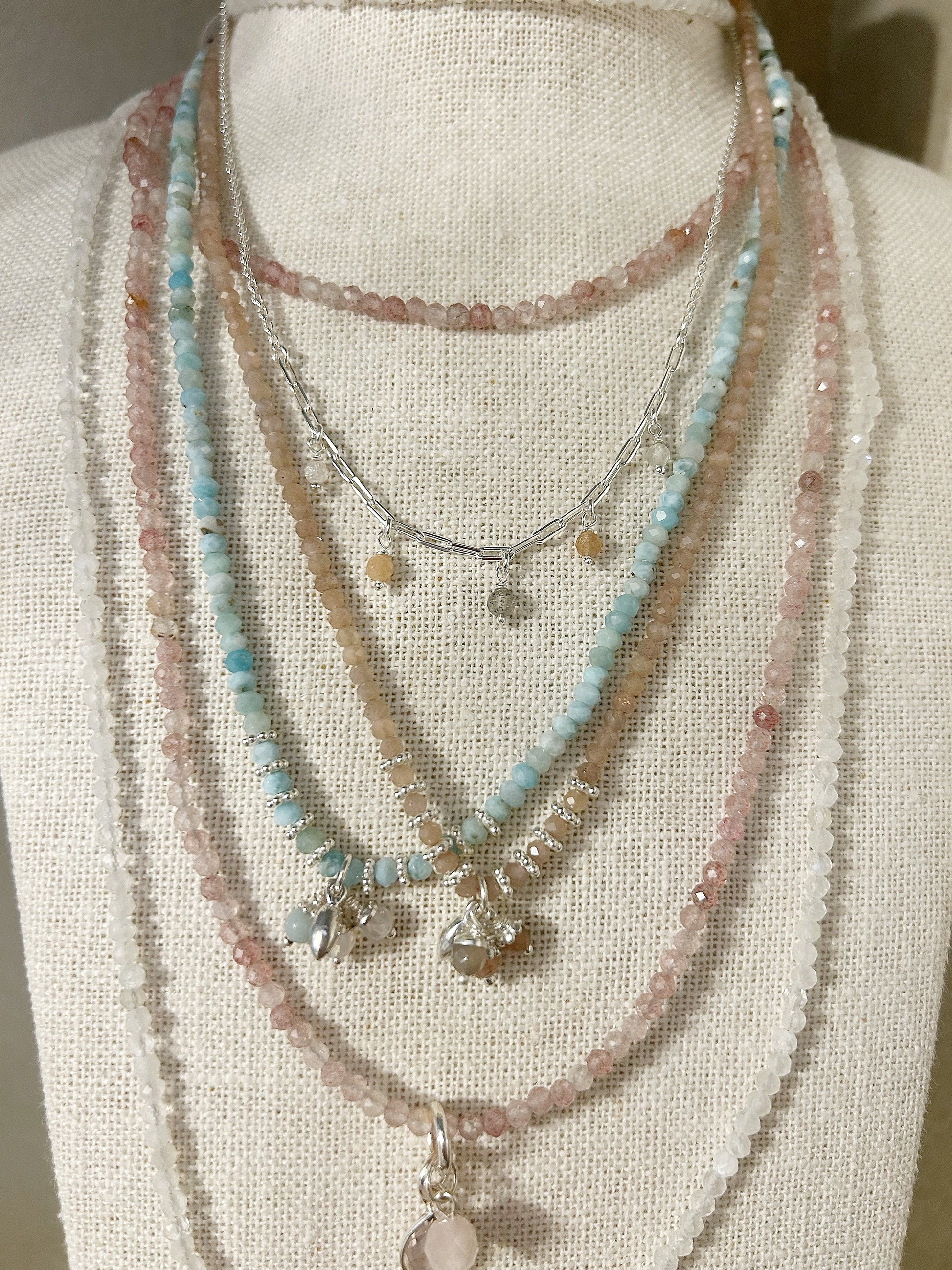 Diese handgefertigte Halskette mit Larimar, Chalcedon und Dumortierit vereint zarte Farben mit kraftvoller Wirkung. Die Edelsteine schimmern in feinem Hellblau und wirken beruhigend und ausgleichend. Der verspielte Anhänger aus verschiedenen Steinperlen macht dieses Schmuckstück zu einem ausdrucksstarken Begleiter im Alltag.