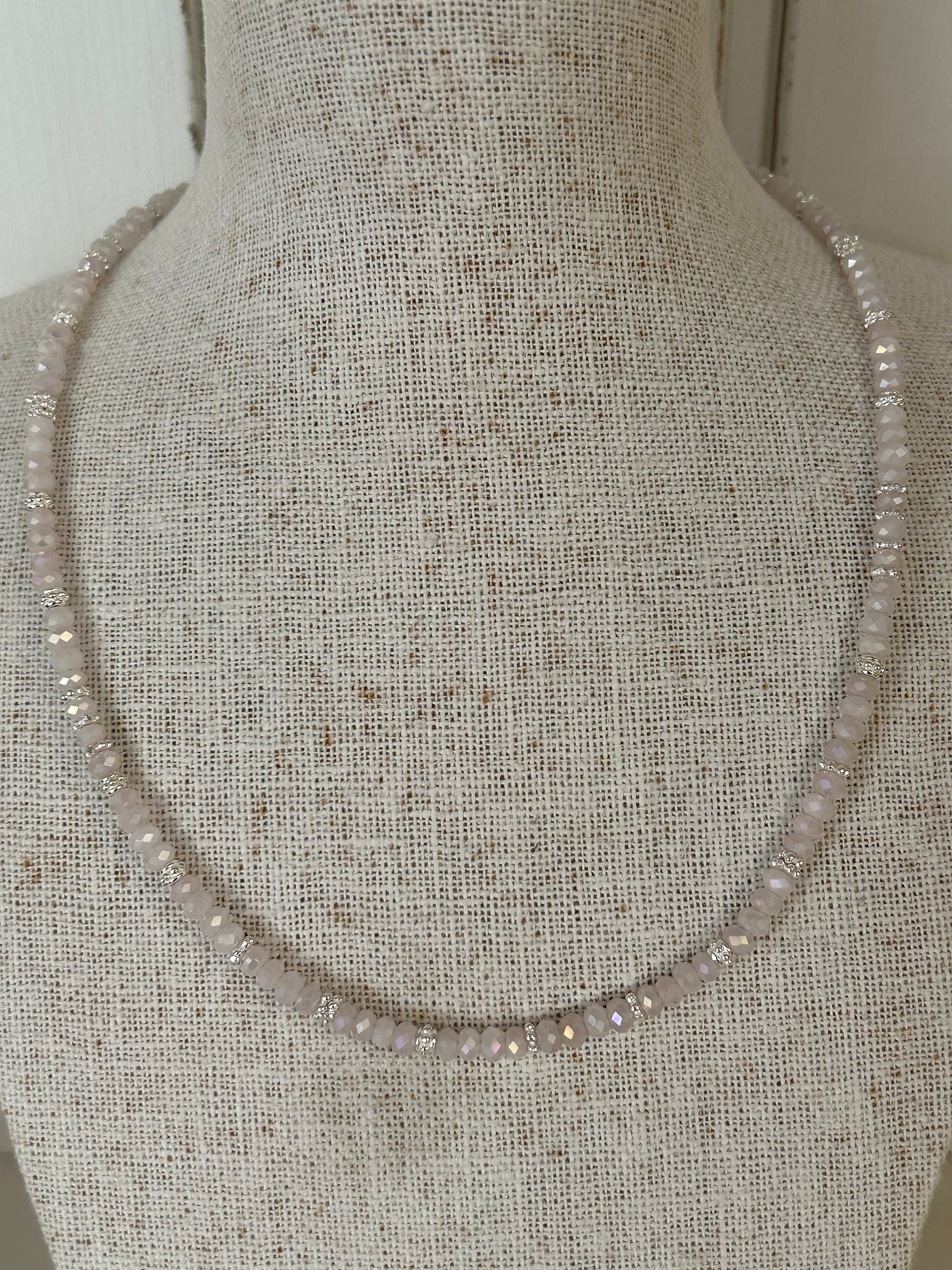 Diese sanfte Halskette aus hellem, facettiertem Rosenquarz mit schimmernden Silberelementen wirkt zurückhaltend und gleichzeitig voller Gefühl. Sie ist ein stilles Symbol für Heilung, Liebe und Geborgenheit – ein Schmuckstück mit Herz und Bedeutung.