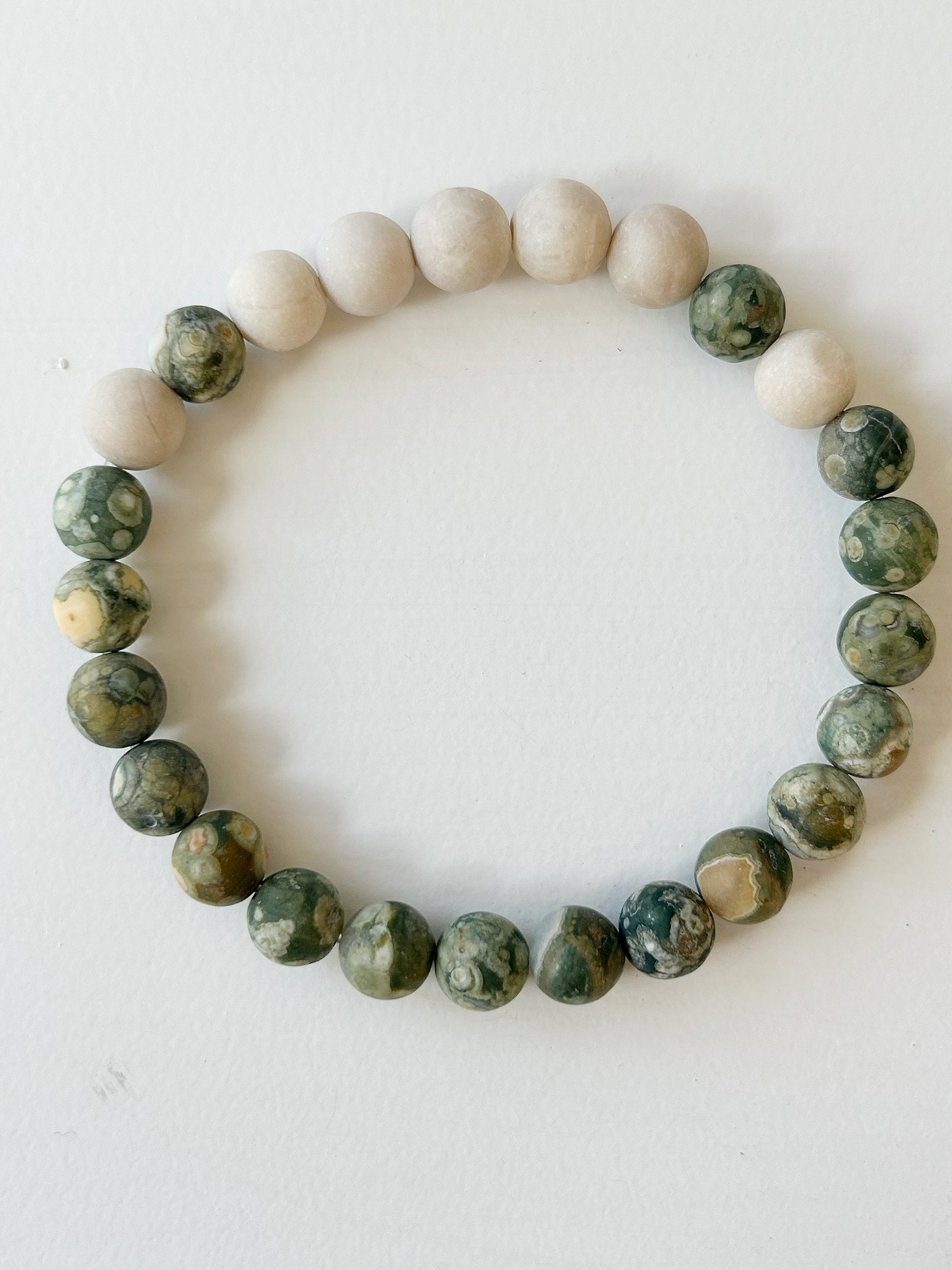 Kraftvoll, geerdet und unverwechselbar – dieses Herrenarmband vereint die natürliche Vielfalt des Ocean-Jaspis mit der ruhigen Eleganz von Riverstone. Die markanten Grüntöne und Maserungen machen jedes Stück zu einem Unikat. Ocean-Jaspis steht für innere Stärke und Ausgeglichenheit, während Riverstone Klarheit und Gelassenheit fördert. Ein stilvoller Begleiter für Männer, die auf Natürlichkeit und Charakter setzen.