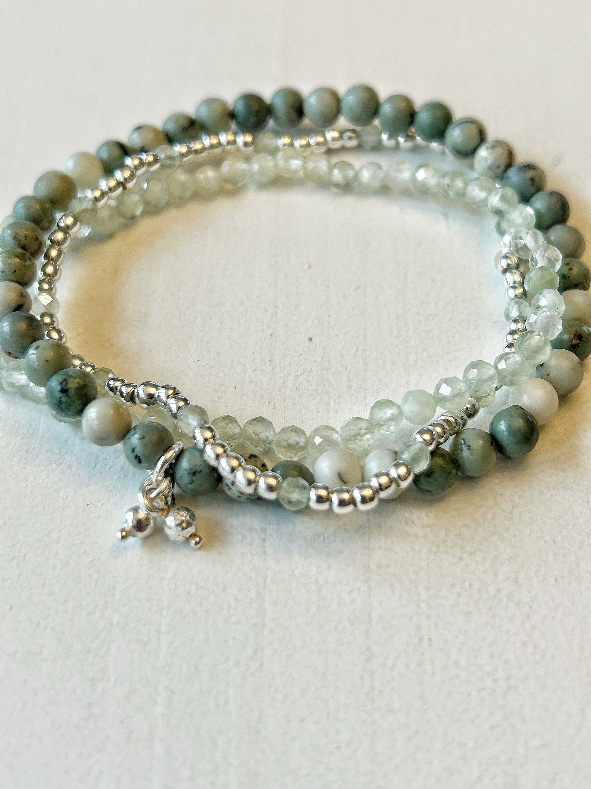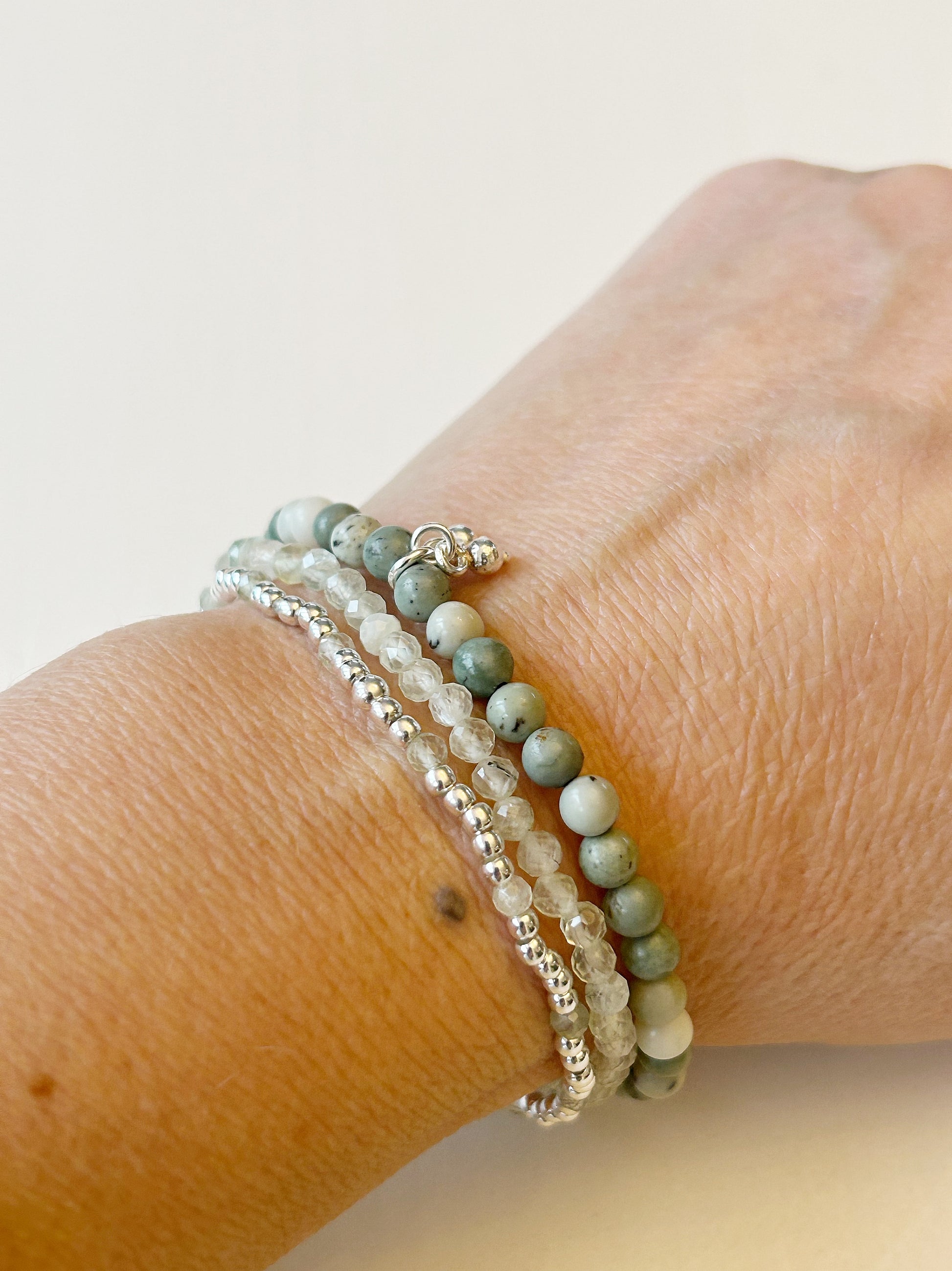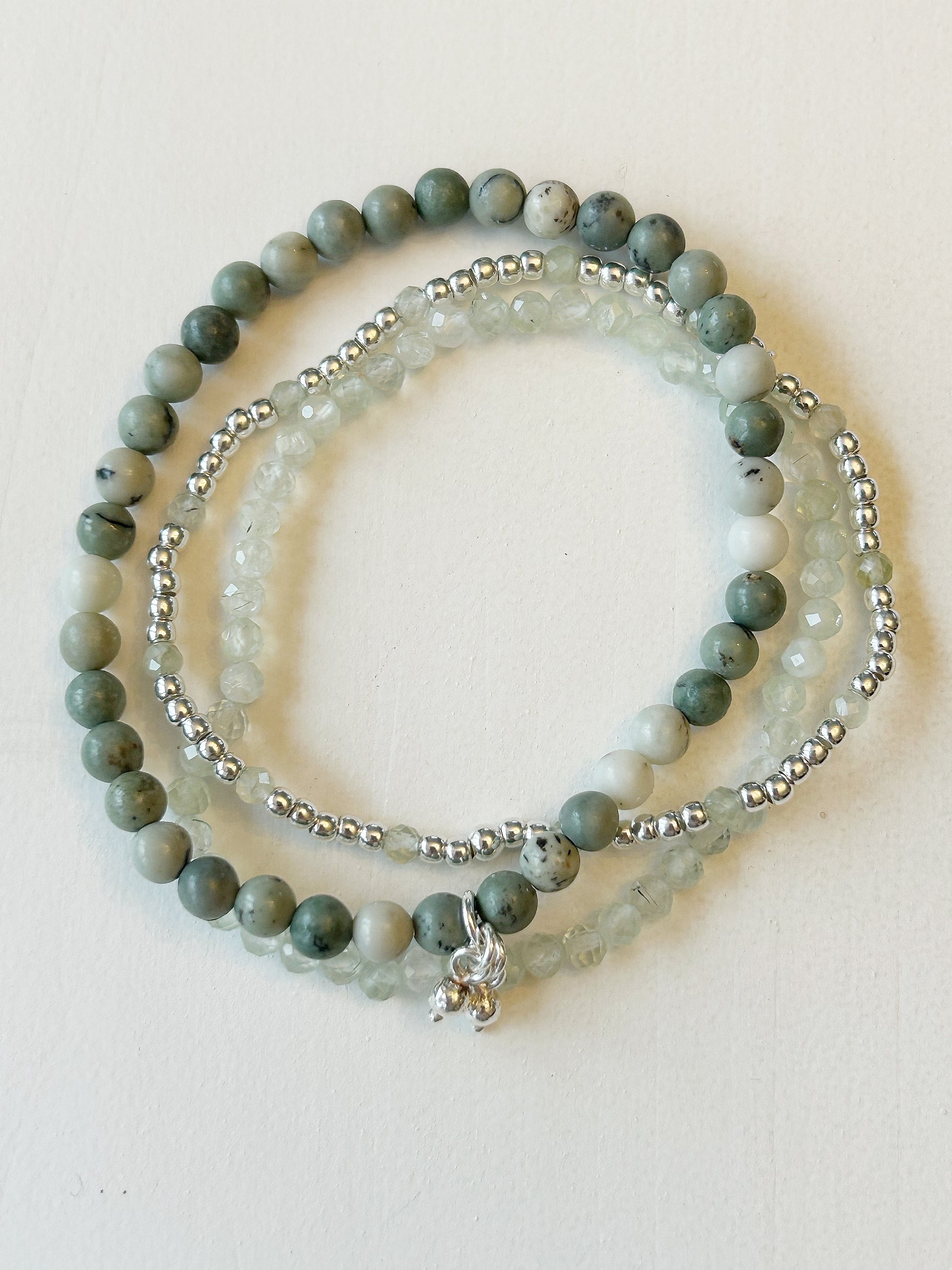 Dieses Armband-Set vereint die ruhige Kraft von lindgrünem Jaspis (6.5 mm) mit der sanften Transparenz von facettiertem Prehnit (3 mm). Ein zartes Silberarmband mit feinen Prehnitperlen in 2 mm ergänzt das Ensemble und bringt eine edle, leichte Note hinein.