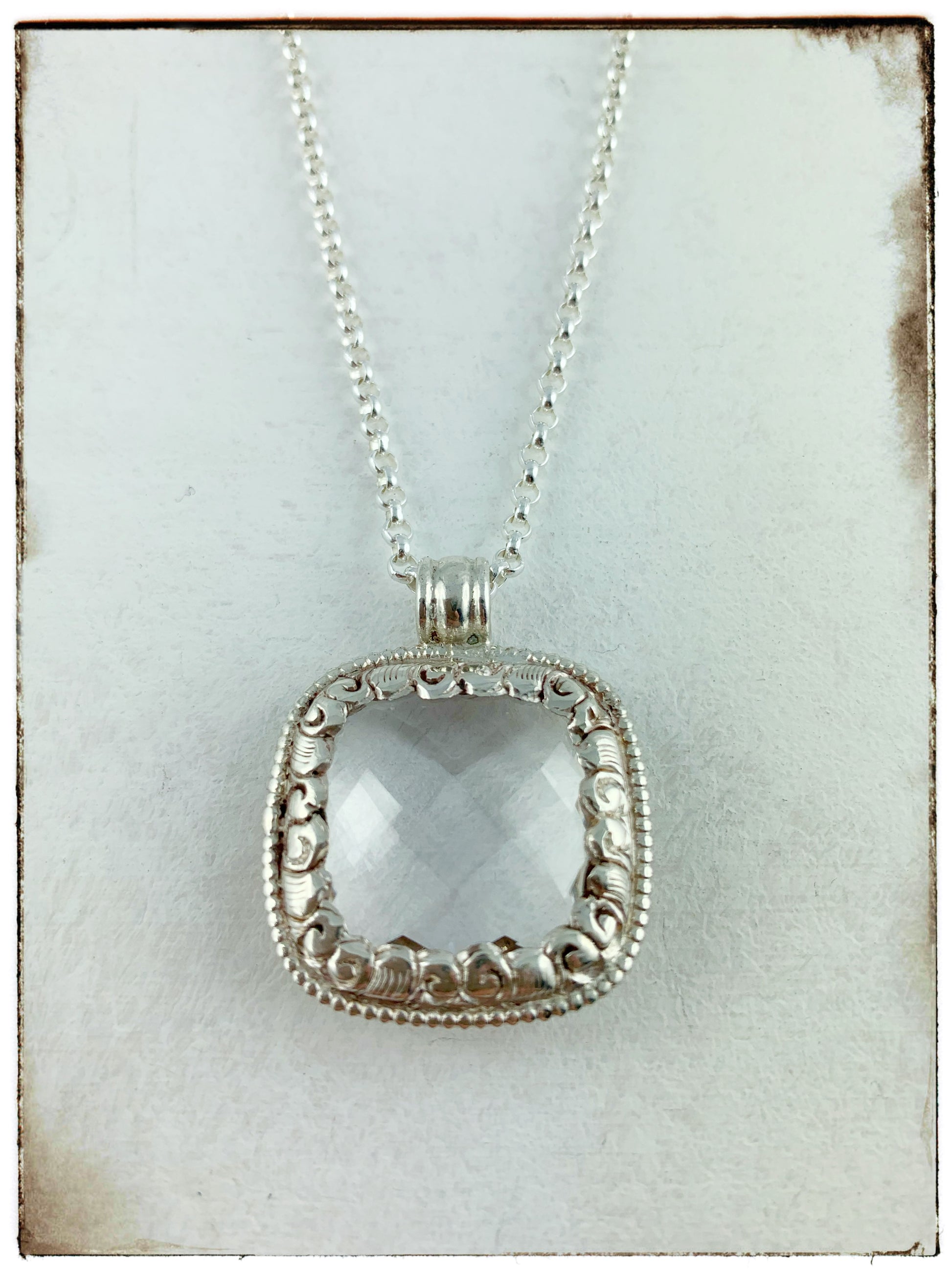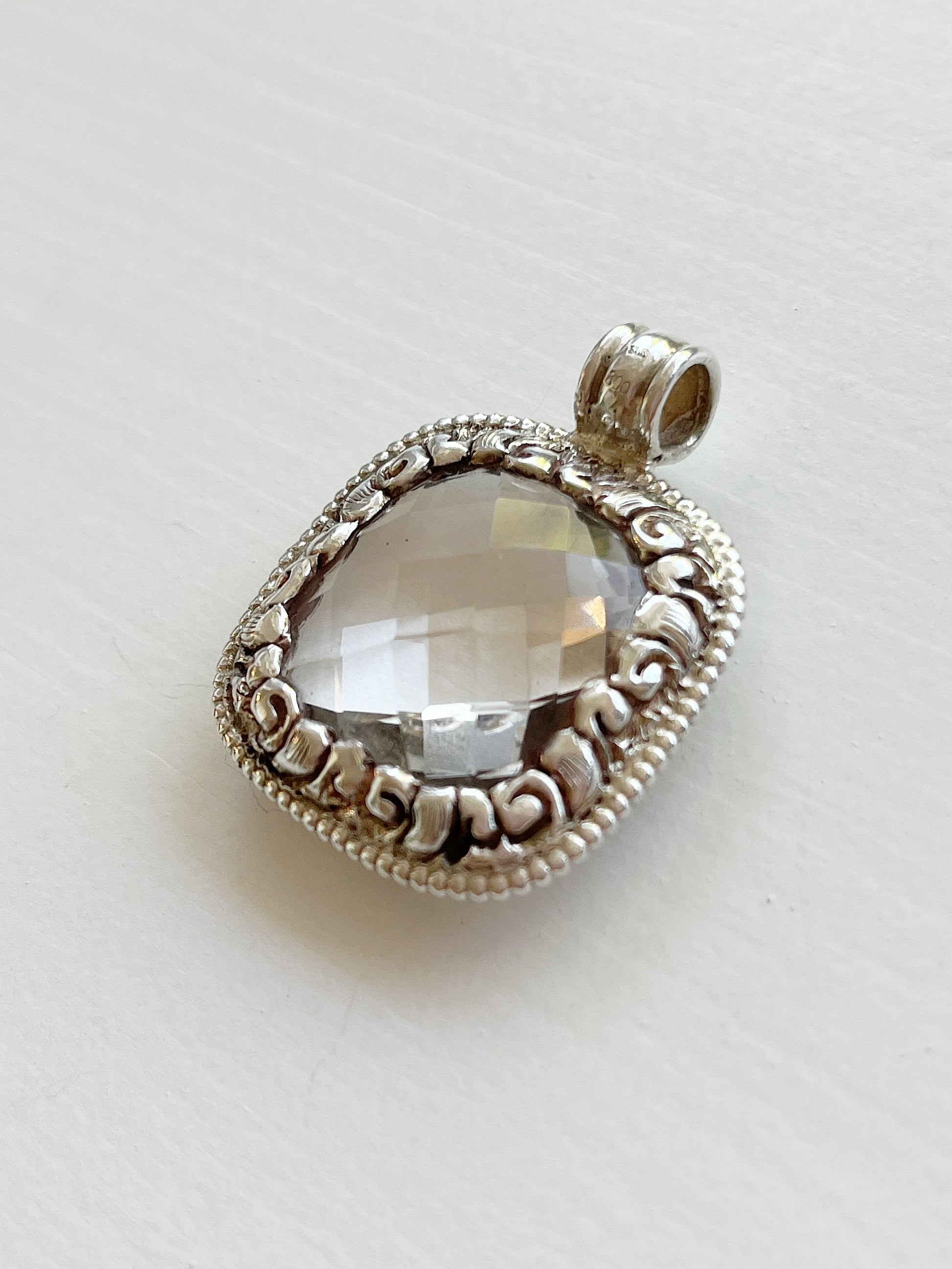 Ein edler Blickfang mit Charakter: Dieser kunstvoll verzierte Anhänger aus 925er Silber trägt einen grossen, facettierten Bergkristall, der das Licht auf sanfte Weise einfängt. Die filigrane Silberfassung verleiht dem Schmuckstück einen Hauch von Vintage-Charme – kraftvoll und elegant zugleich.