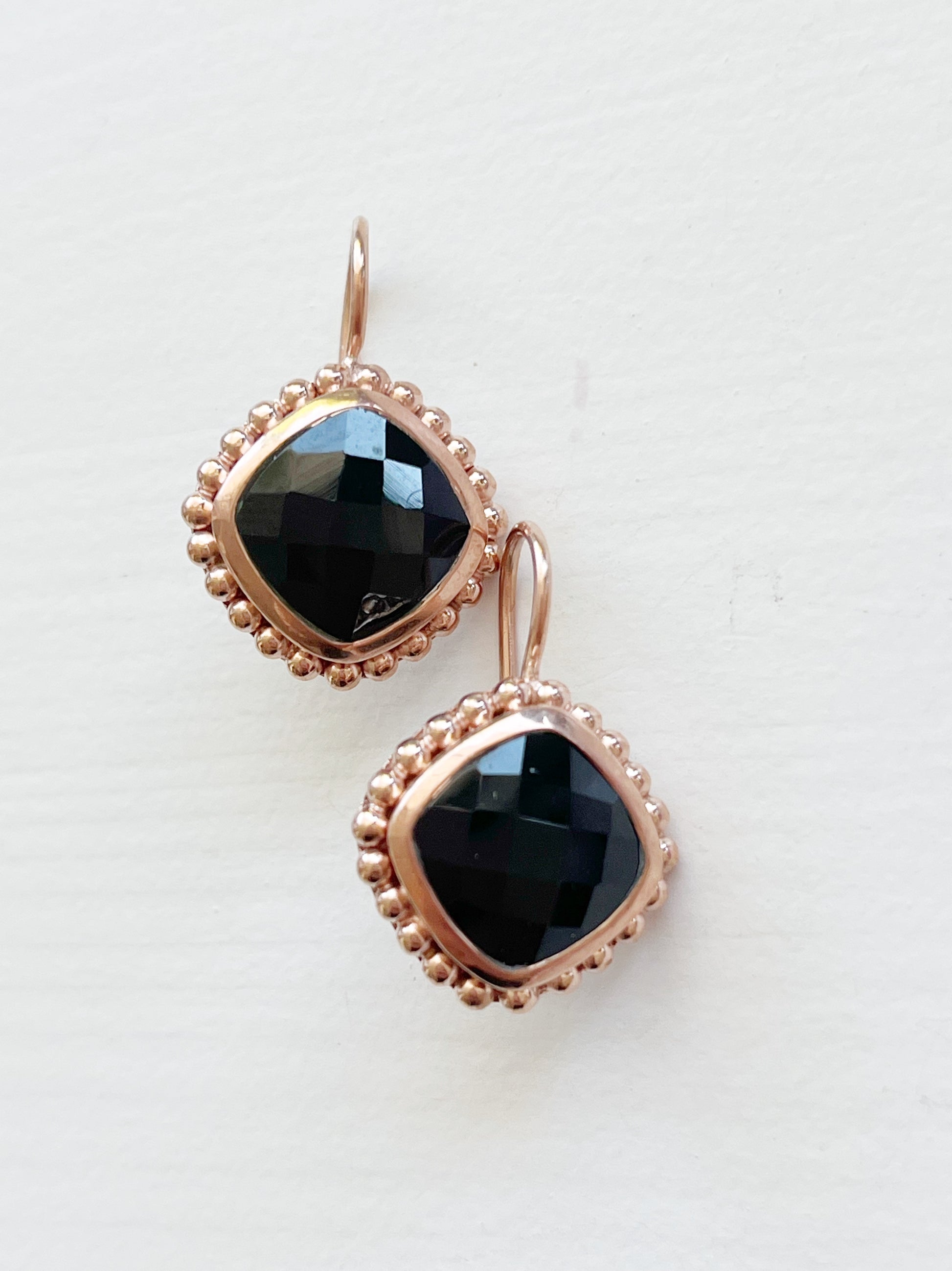 Diese edlen Ohrhänger mit facettiertem schwarzem Spinell und zarter Rosévergoldung verbinden zeitlose Eleganz mit einer kraftvollen Ausstrahlung. Sie wirken feminin, modern und selbstbewusst – ein auffälliger Blickfang, der jedes Outfit veredelt.