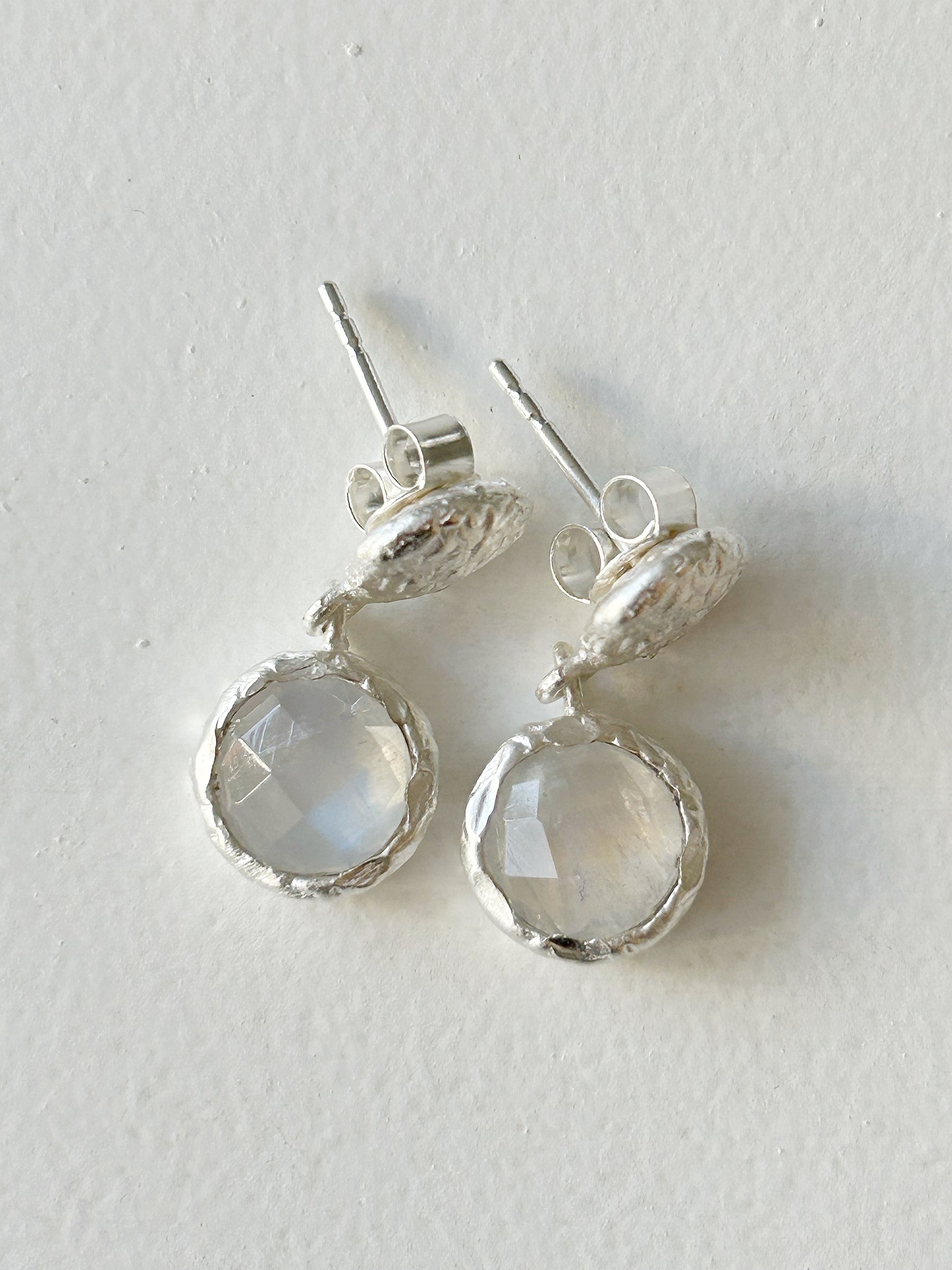 Diese bezaubernden Ohrhänger mit facettiertem Regenbogenmondstein und handgearbeitetem Stecker aus Silber fangen das Licht auf besondere Weise ein – schimmernd, elegant und doch verspielt.