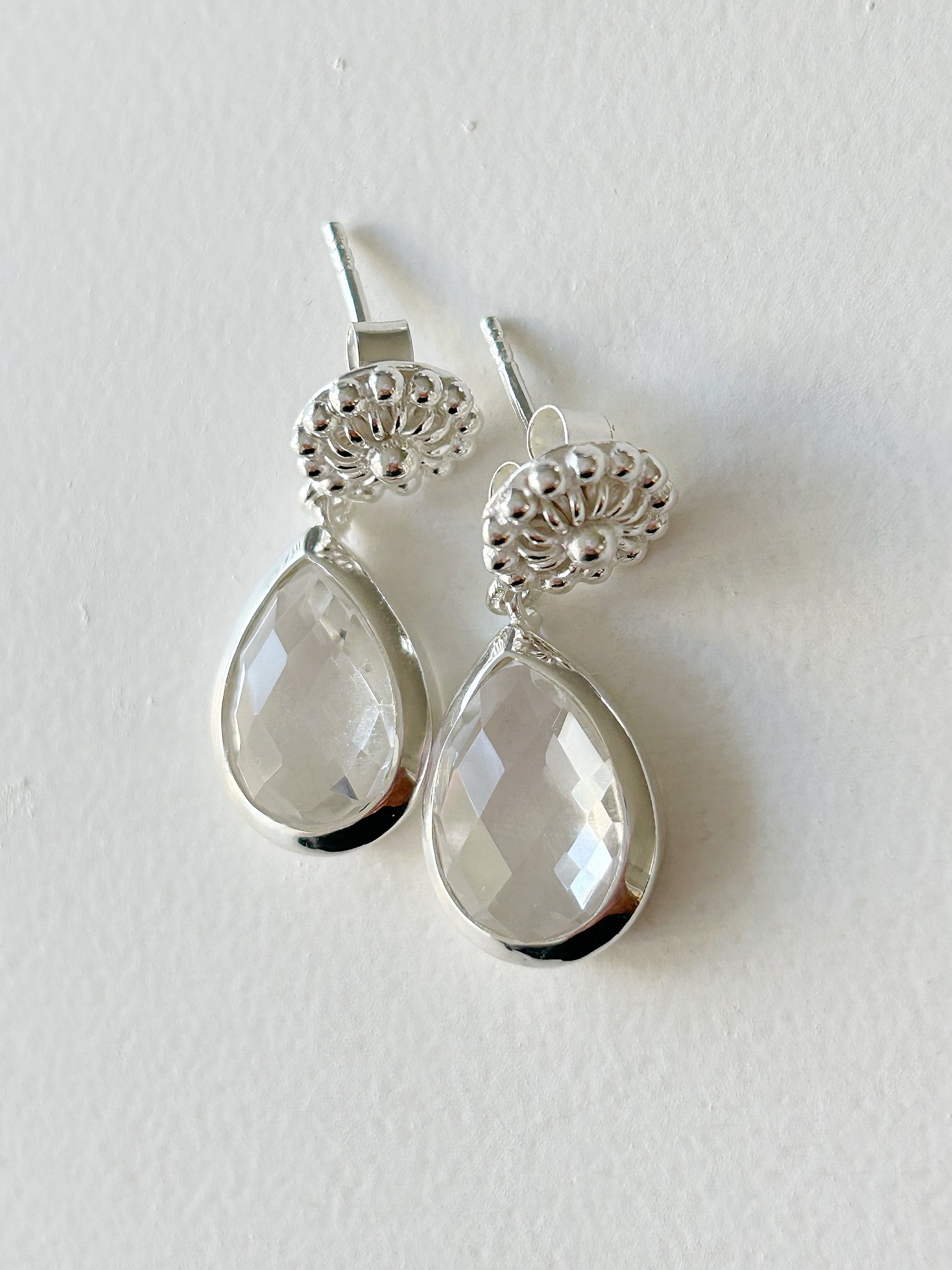 Diese edlen Ohrhänger mit facettiertem Bergkristall und kunstvoll verziertem Stecker sind ein wahrer Blickfang – zeitlos und gleichzeitig fein verspielt.