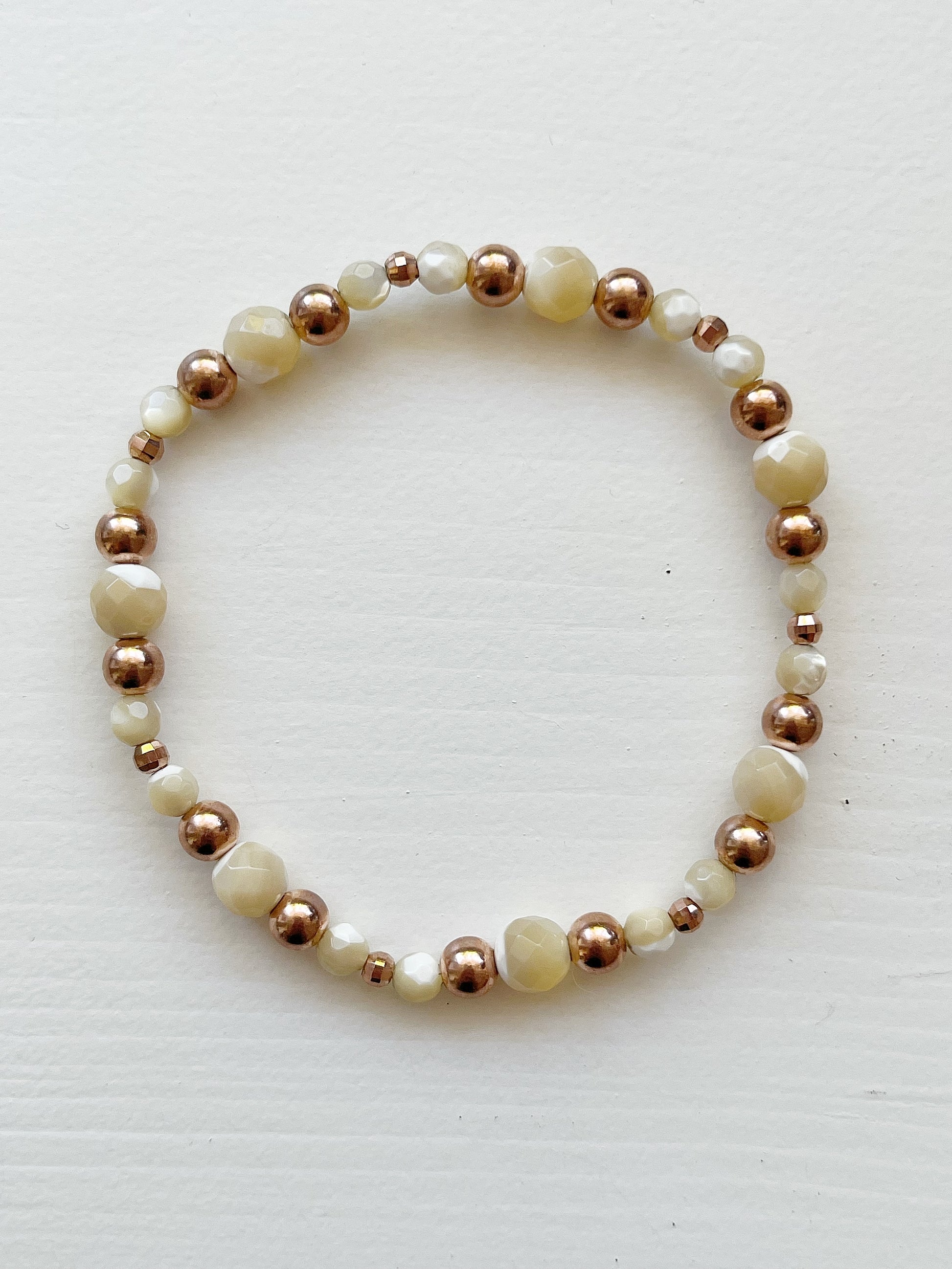 Dieses liebevoll gestaltete Armband vereint die natürliche Eleganz von glänzendem Perlmutt mit der warmen Ausstrahlung rosévergoldeter Details. Die unterschiedlichen Steingrössen lassen das Licht zart tanzen und verleihen dem Schmuckstück eine feine, feminine Note – schlicht, aber wirkungsvoll.