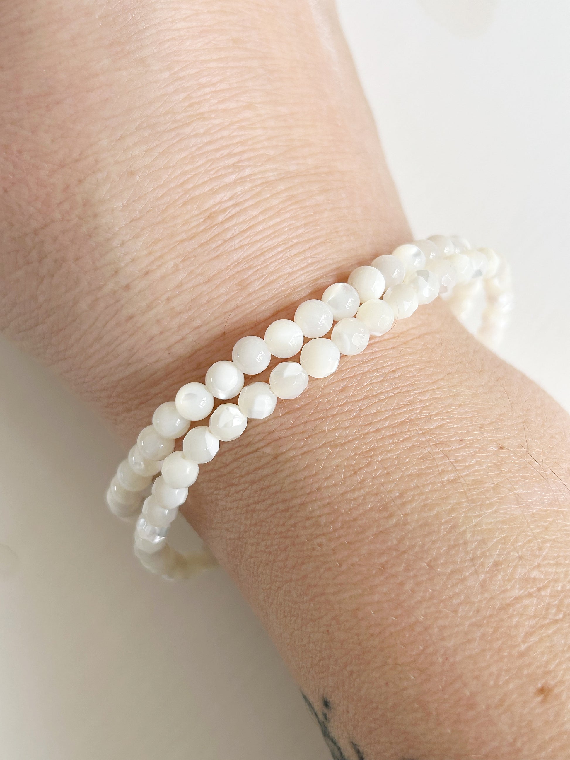 Dieses Armband aus edlem Perlmutt fasziniert durch seinen sanften Glanz und die schlichte Eleganz. Die schimmernden Weiß- und Creme-Nuancen erinnern an Muscheln im Morgengrauen – dezent, feminin und harmonisch.