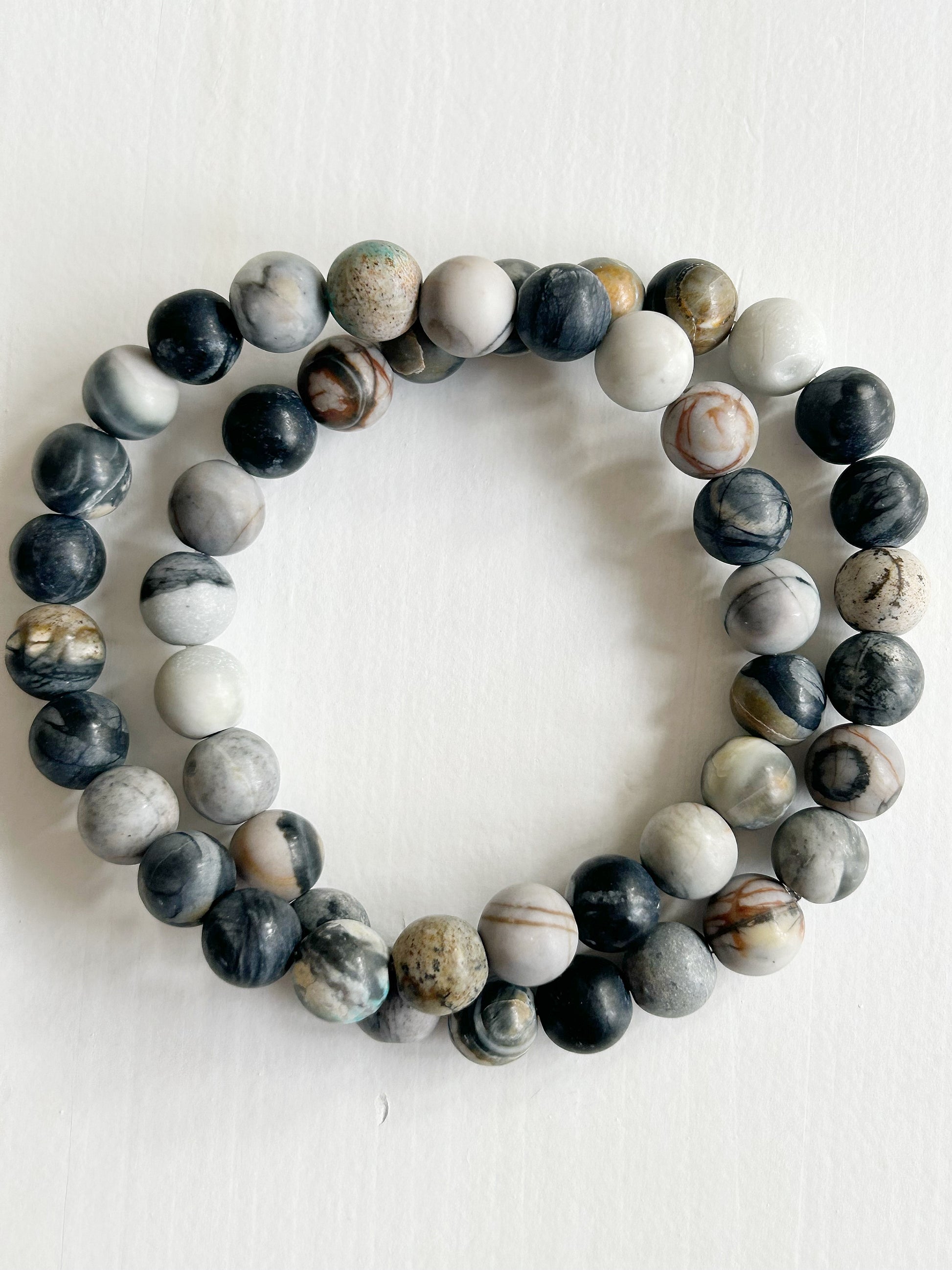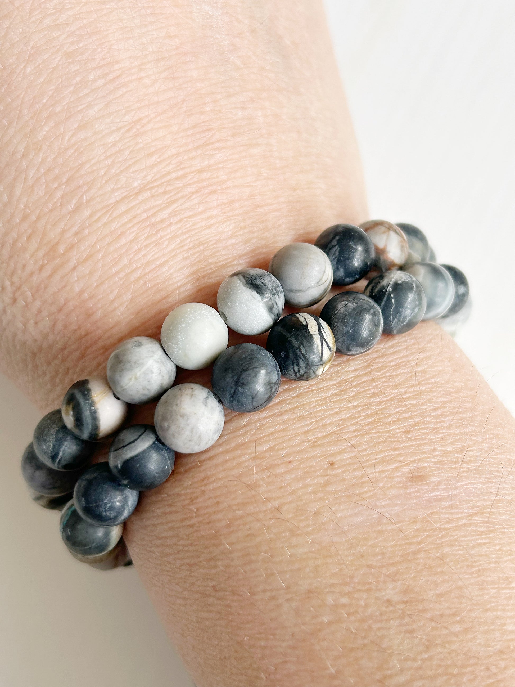 Kreativ, klar und ausgleichend – dieses Armband aus mattem Picasso-Jaspis verbindet künstlerische Ausdruckskraft mit natürlicher Gelassenheit. Die fein gemaserten Steine in Grau-, Weiß- und Schwarztönen machen jedes Exemplar zu einem kleinen Unikat mit ruhiger, stilvoller Ausstrahlung.