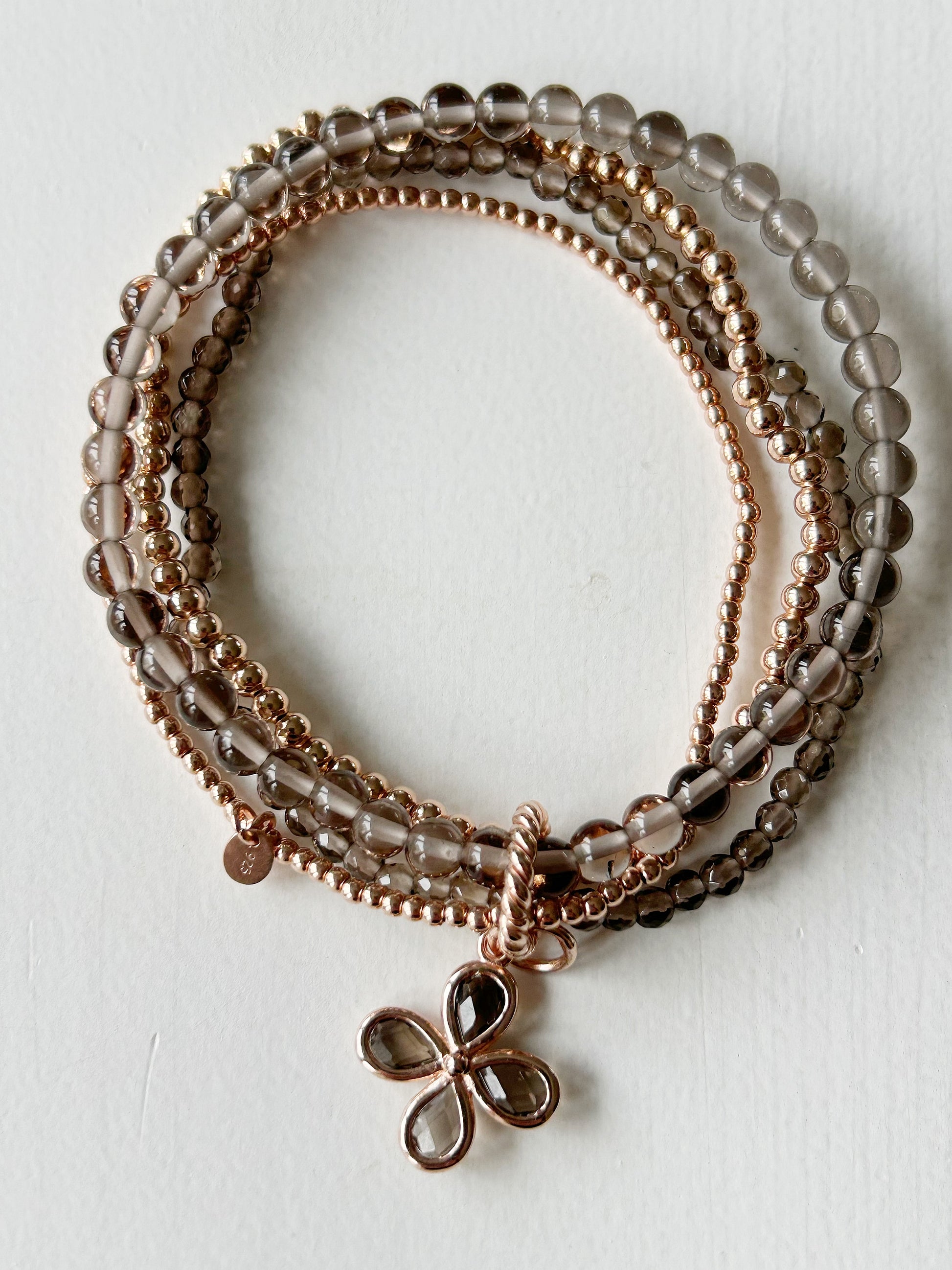 Dieses harmonische Armband-Set kombiniert warm schimmerndes Roségold in 2 mm und 3 mm mit feinem Rauchquarz in 3 mm und 4 mm. Die sanft transparenten Rauchquarzperlen verleihen dem Ensemble Tiefe und eine ruhige, erdige Ausstrahlung, während das Roségold einen edlen, femininen Akzent setzt.